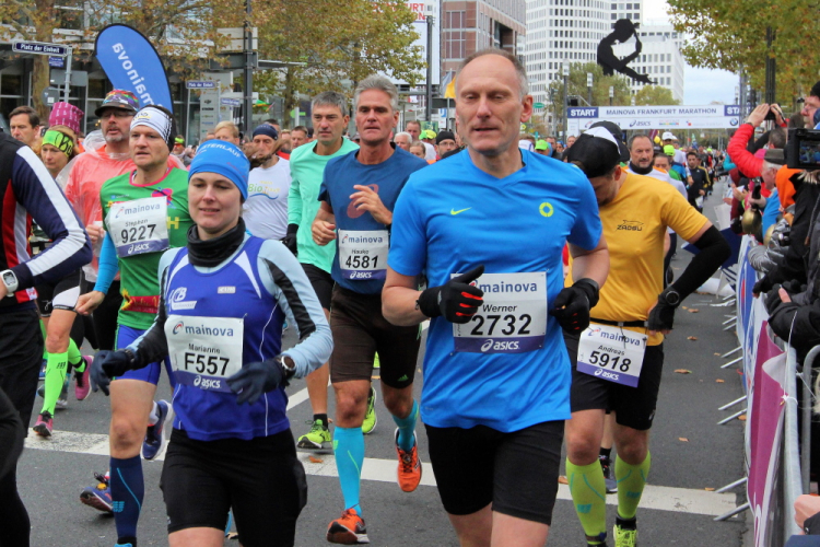 Die Stimmung vor dem Messeturm ist super. Nervosität bei den Spitzenläufern, bei denen es um Rekorde, Qualifikationen und Moneten geht, und bei den vielen Rookies, die sich Frankfurt für ihren ersten Lauf über 42,195 km ausgewählt haben. Erst nach dem Startschuss setzt die Musik ein: „Keep on Running“, die Hymne der Spencer Davis Group aus den 60ern. Auf geht’s, zum großen Jubiläumslauf.