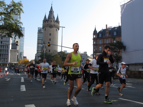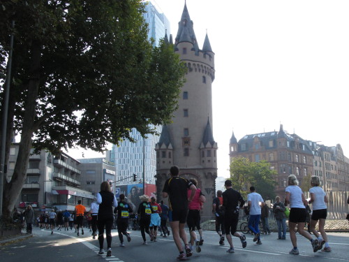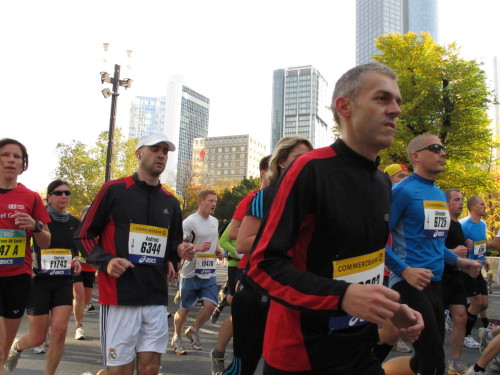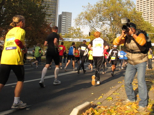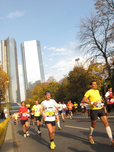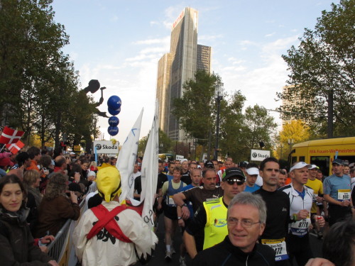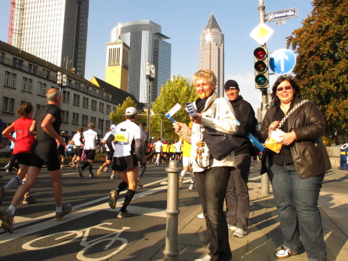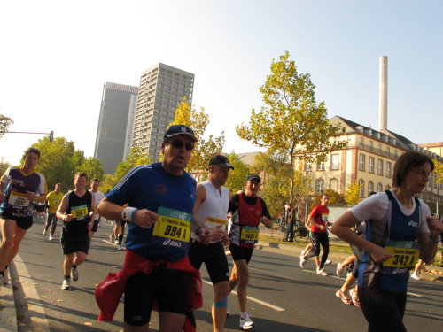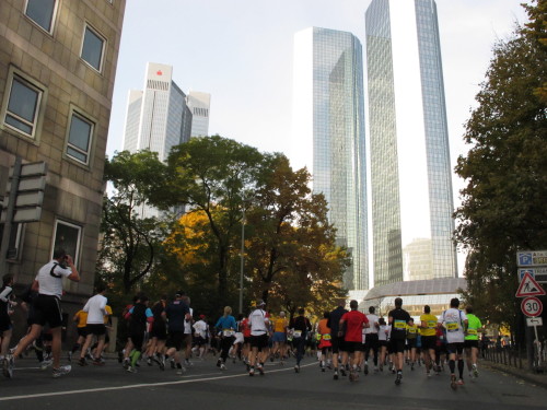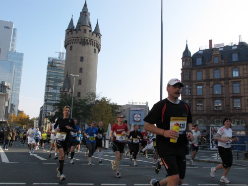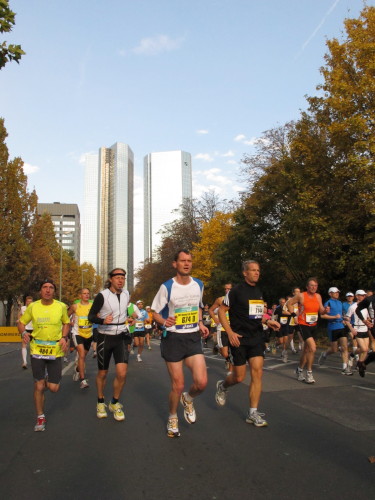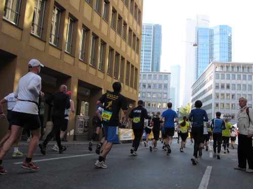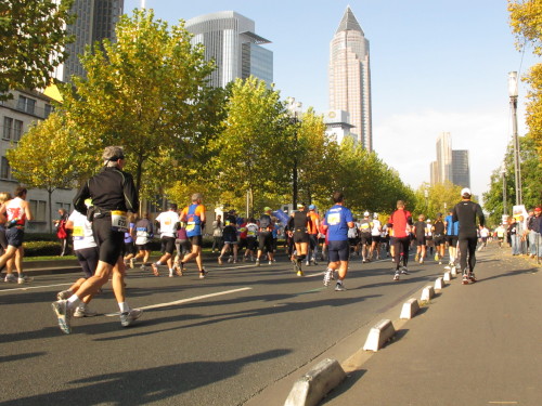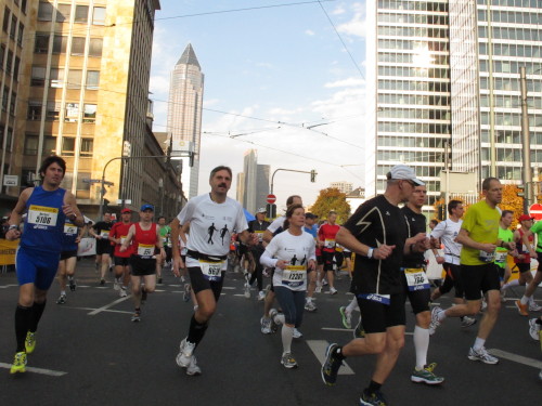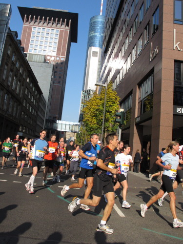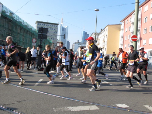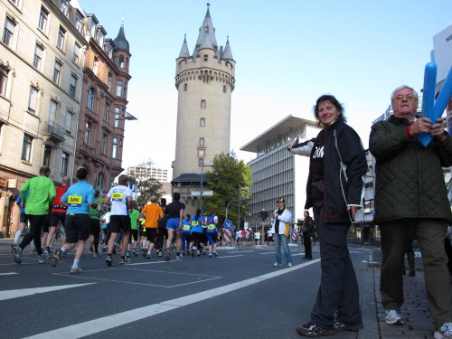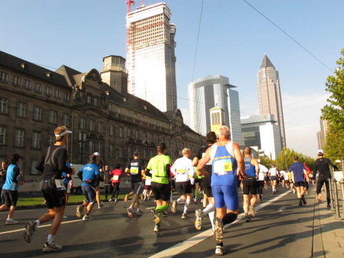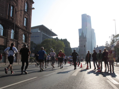 In den 60er Jahren habe ich bei diesem Song der Spencer Davis Group die Tanzflächen gestürmt. Über 40 Jahre später stürze ich mich dazu mit 13.000 anderen in ein Vergnügen ganz anderer Art. Zwei Jahre konnte ich verletzungsbedingt nicht in Frankfurt starten, heute läuft es wieder rund. Ich bin happy. Tausende Zuschauer stehen auf dem ersten Kilometer, der uns zum Platz der Republik und von dort gleich in die Schluchten der gläsernen Bankpaläste bringt. Am imposantesten sind die 155 m hohen Zwillingstürme der Deutschen Bank, auch Soll und Haben genannt. Wir laufen eine kleine Schleife in den Häuserschluchten, kommen zurück auf die Mainzer Landstraße und haben das Gefühl, Frankfurt bebt. Überall Trommelwirbel, Musik und der Applaus und der Lärm von tausenden Zuschauern. Da stehen Vanman Jochen Heringhaus ganz ohne Gel die Haare zu Berge. Sein Arbeitsplatz ist heute wieder auf dem Dach seines „Dienstwagens“, von wo aus er das Geschehen überblickt und kommentiert. Gute Fotos soll ich machen, ruft er mir zu.