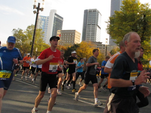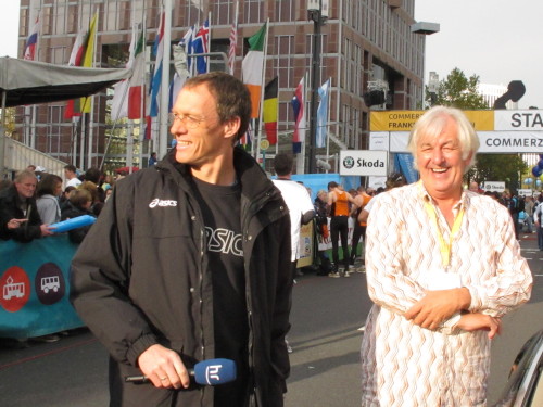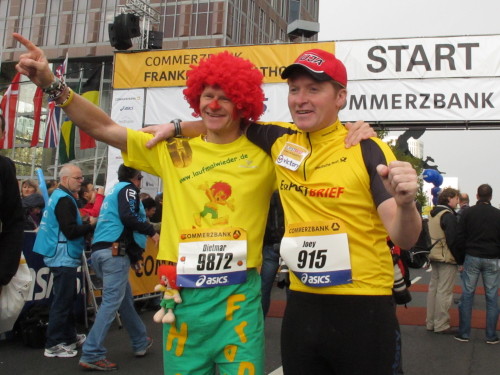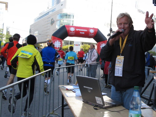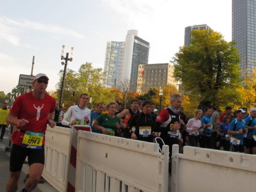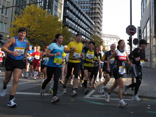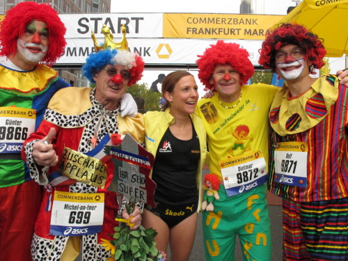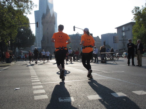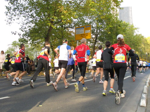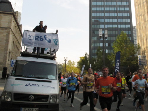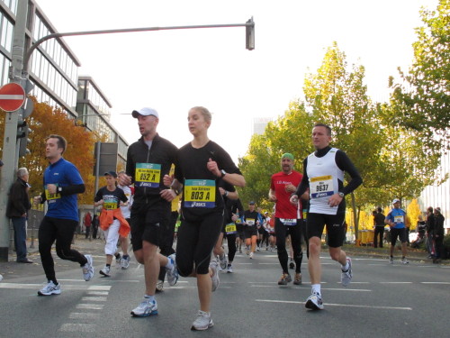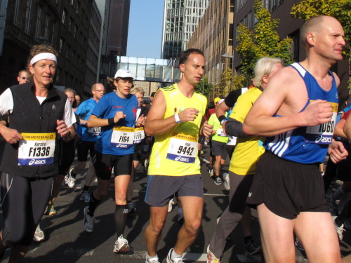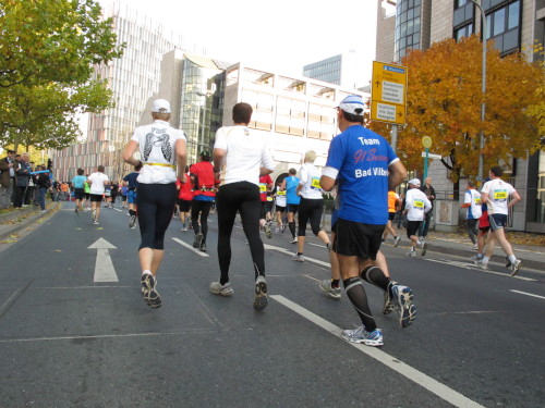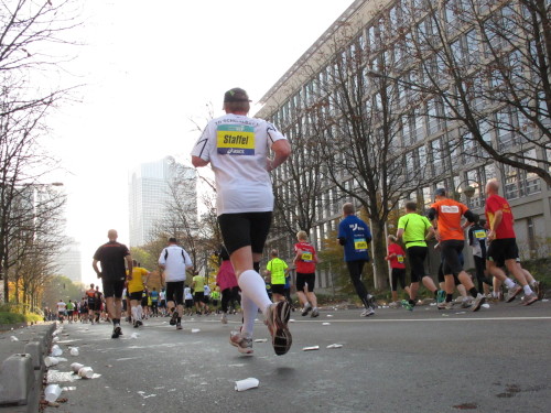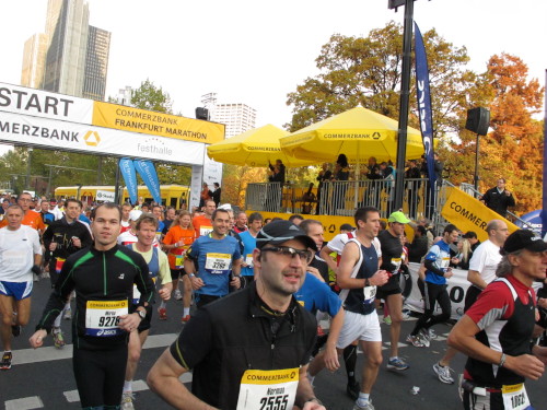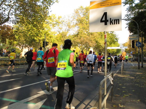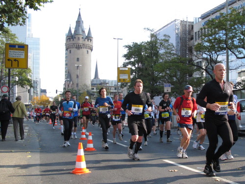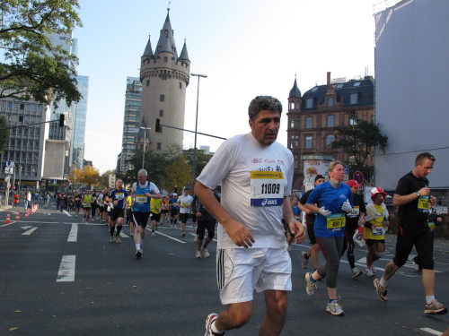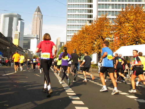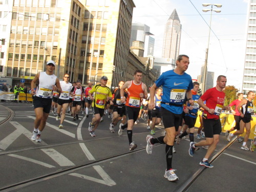 In den 60er Jahren habe ich bei diesem Song der Spencer Davis Group die Tanzflächen gestürmt. Über 40 Jahre später stürze ich mich dazu mit 13.000 anderen in ein Vergnügen ganz anderer Art. Zwei Jahre konnte ich verletzungsbedingt nicht in Frankfurt starten, heute läuft es wieder rund. Ich bin happy. Tausende Zuschauer stehen auf dem ersten Kilometer, der uns zum Platz der Republik und von dort gleich in die Schluchten der gläsernen Bankpaläste bringt. Am imposantesten sind die 155 m hohen Zwillingstürme der Deutschen Bank, auch Soll und Haben genannt. Wir laufen eine kleine Schleife in den Häuserschluchten, kommen zurück auf die Mainzer Landstraße und haben das Gefühl, Frankfurt bebt. Überall Trommelwirbel, Musik und der Applaus und der Lärm von tausenden Zuschauern. Da stehen Vanman Jochen Heringhaus ganz ohne Gel die Haare zu Berge. Sein Arbeitsplatz ist heute wieder auf dem Dach seines „Dienstwagens“, von wo aus er das Geschehen überblickt und kommentiert. Gute Fotos soll ich machen, ruft er mir zu.