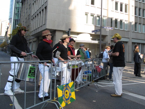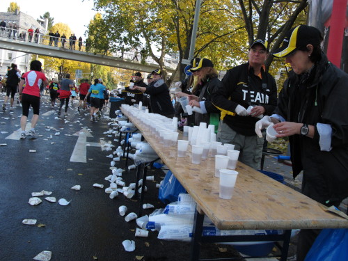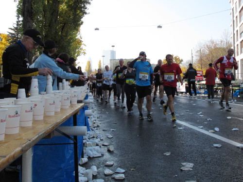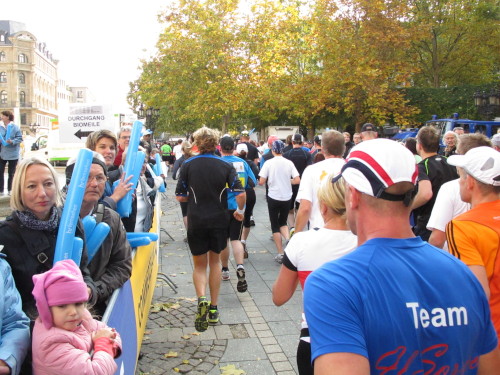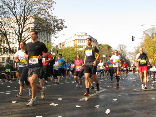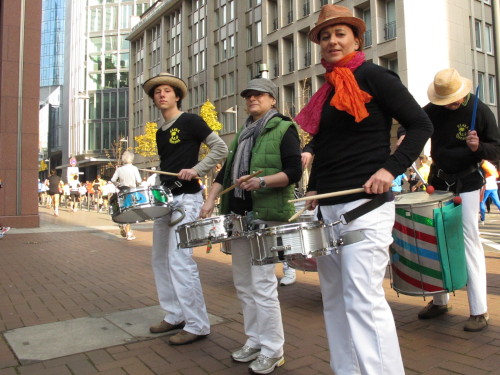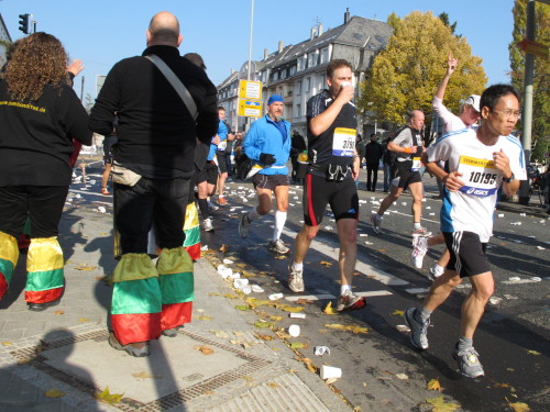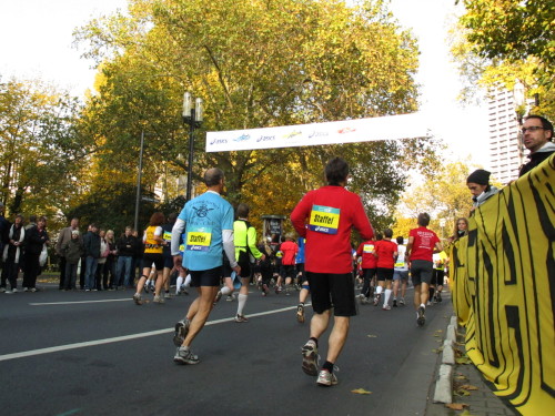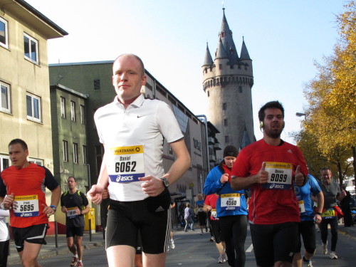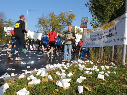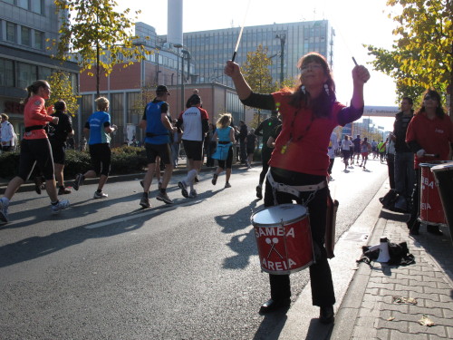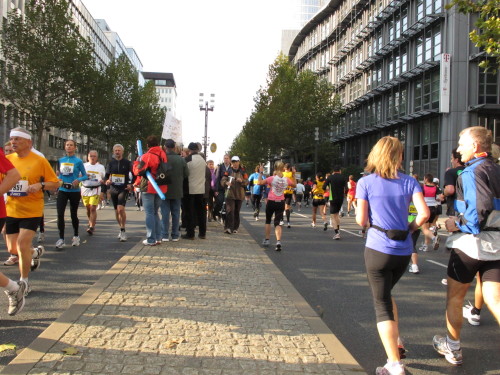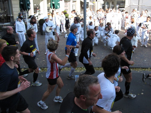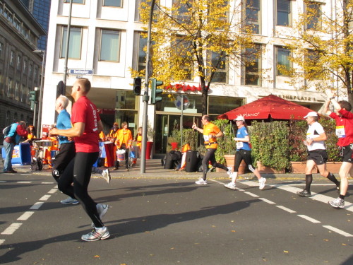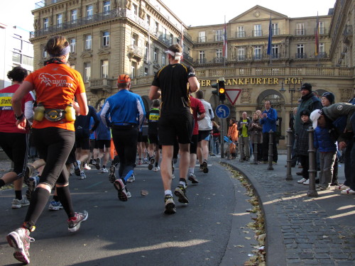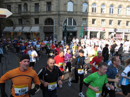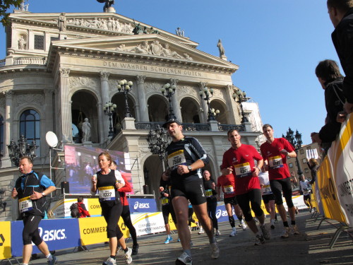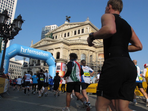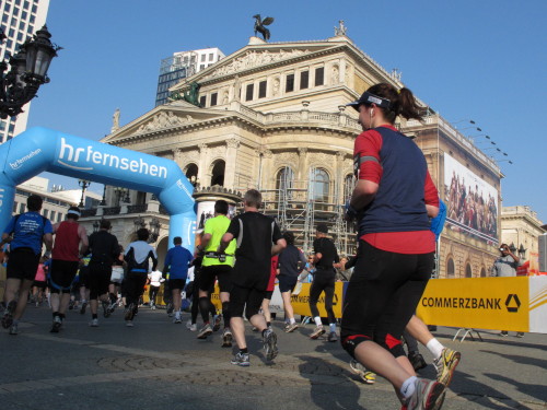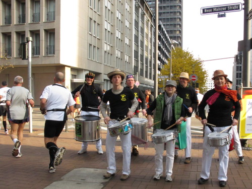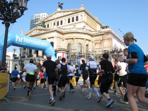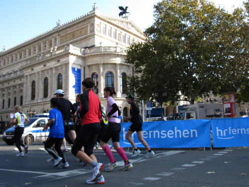 Dann sind wir das erste Mal bei der Alten Oper. Ist hier Kirmes oder was? Zwischen den zwei abgesperrten Laufbahnen ist Partyzone. Es riecht nach Gegrilltem und Bier, die Musik ist rhythmisch, die Zuschauer laut, der Puls viel zu hoch und dann kommen die ganz in weiß gekleideten Sambistas von Bloco X und geben uns schon bei km 7 den Rest. Im ehrwürdigen Frankfurter Hof, der ältesten Herberge der Stadt, vibriert das Geschirr in den Vitrinen. Bis zur Hauptwache stehen viele Zuschauer, bestens unterhalten und informiert von Artur Schmid.