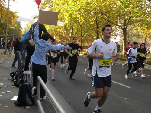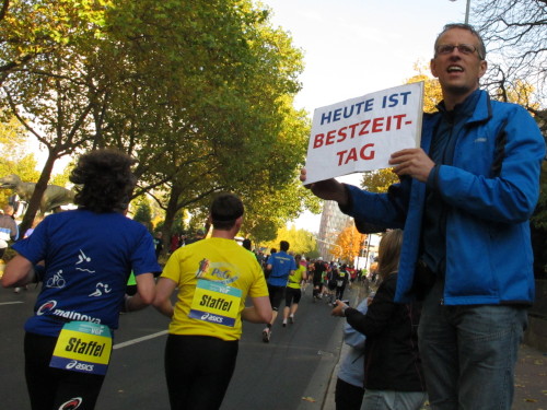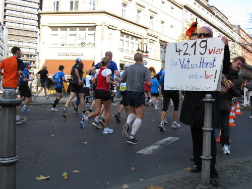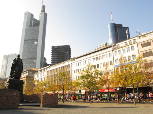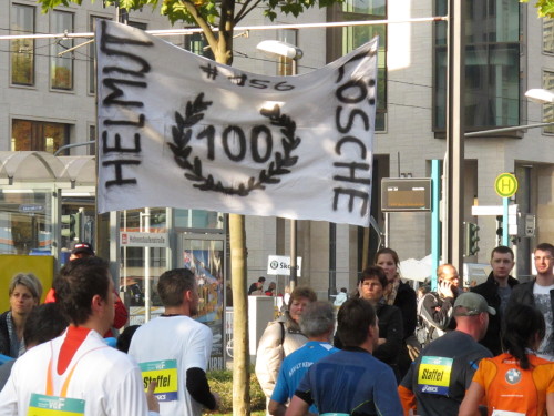 Immer den an einen Bleistift erinnernden Messeturm vor Augen, laufen wir ins vornehme Westend. Der Fanclub von Helmut Lösche feiert seinen 100. Marathon. Es soll der letzte des 75jährigen sein. Ist das Dein Ernst, Helmut? Hey, was stand da auf der Tafel, die der Mann in die Läufermenge hält? „Heute ist Bestzeittag“. Das kann noch von Bedeutung werden. Also muss es aufs Bild. Ich stoppe und gehe zurück. Das wird was heute, 4 km gelaufen und 30 Fotos gemacht. Und dann: Was macht der denn da? Ein paar Zuschauer rennen irritiert zur Seite, als ich beim Goetheplatz die Strecke verlasse und versuche, Dichterstaute, Hochhäuser und Läuferschlange auf ein Bild zu bringen.