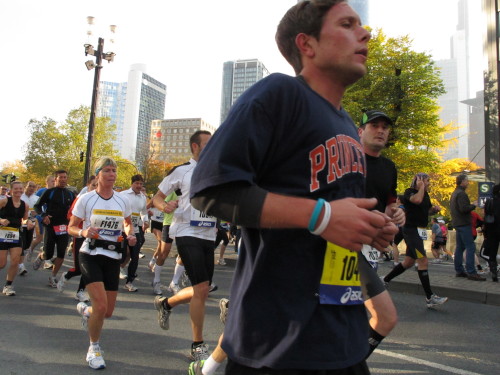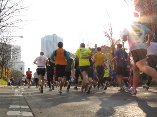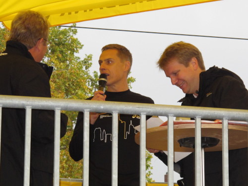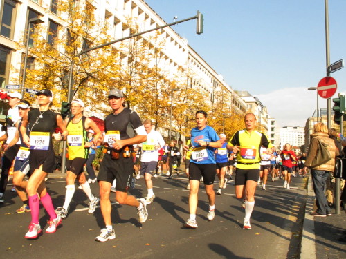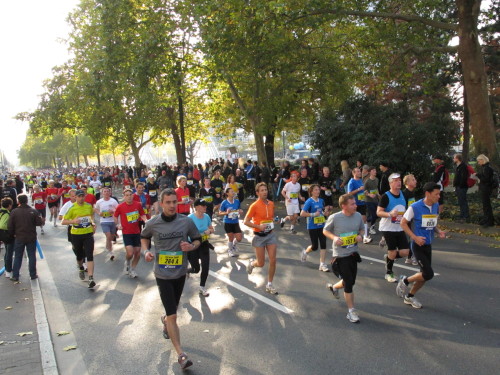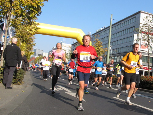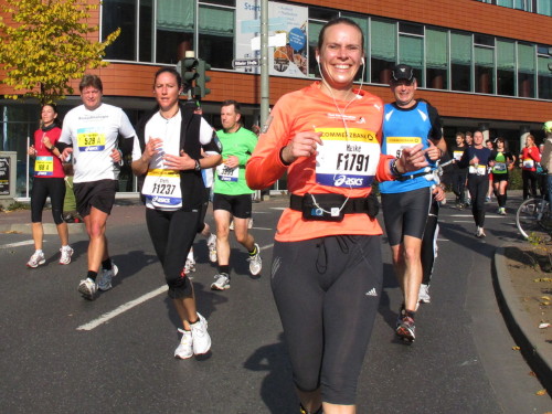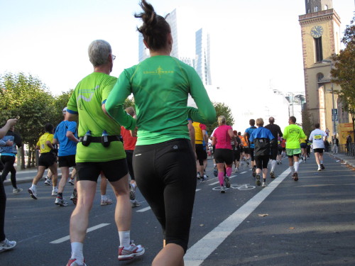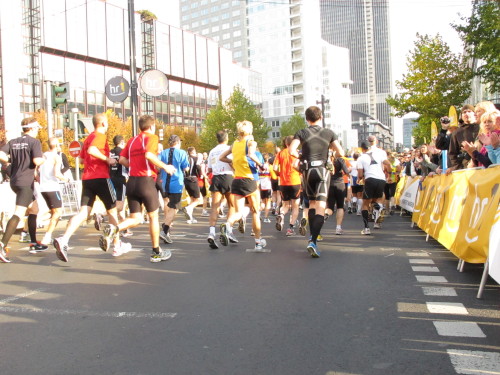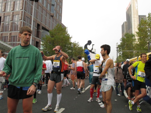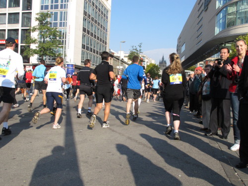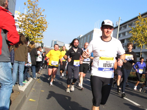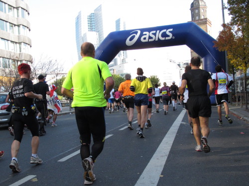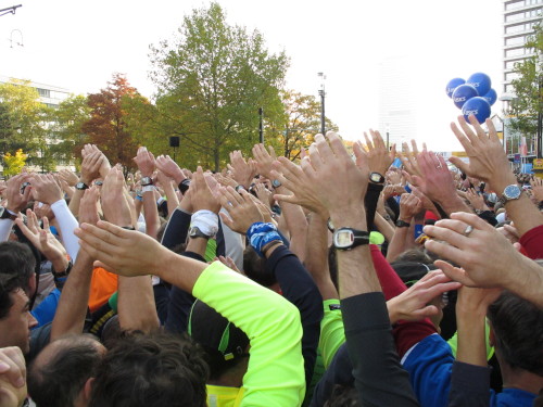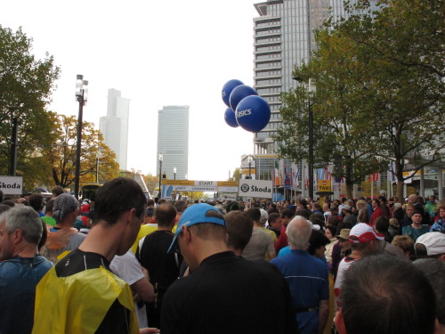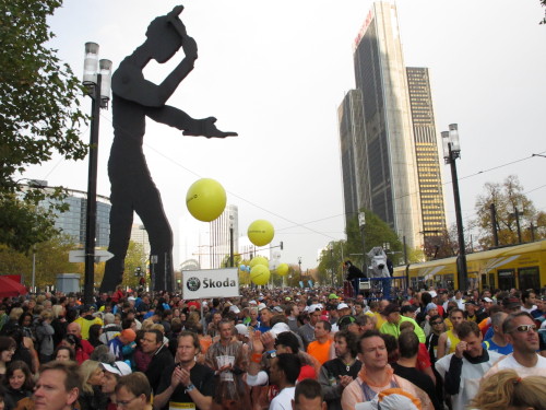 In der Nacht hat es geregnet. Jetzt ist der Himmel klar, nur ein paar harmlose Wolken sind zu sehen. Den Kleiderbeutel geschultert, kommen aus der allen Richtungen Läuferinnen und Läufer am Messeturm zusammen. Der Start ist um 10.00 Uhr, Zeit genug für diejenigen, die erst heute anreisen, sich die Startnummer zu holen, den Chip zu checken und einen Gang über die Marathonmall zu machen. Eine Etage tiefer gibt man seinen Kleiderbeutel ab. Verlässt man das Foyer im Erdgeschoß, ist man direkt am Startplatz. Einige Promis werden präsentiert, unter ihnen der Finnische Außenminister Alexander Stubb, und natürlich die Laufelite aus Kenia und Äthiopien. Aus einer Kanone wird der Startschuss abgeben und mit „Keep on Running“ geht es auf die Strecke.