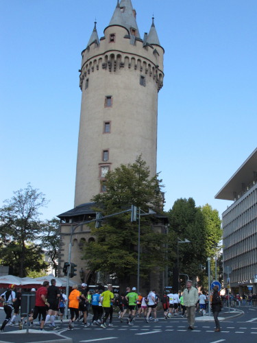 „Achtung Bodenschwelle“ lese ich auf dem Schild am Laternenmast. Danke für den Hinweis. Meine Wunden vom Ballermann-Absturz sind noch nicht verheilt. Vor uns taucht der Eschenheimer Turm auf, Rest der spätmittelalterlichen Stadtbefestigung und eines der Frankfurter Wahrzeichen. Nach der Umrundung geht es ein zweites Mal über den Opernplatz, dann ist die Stimmungsorgie vorübergehend zu Ende. Es geht auf der Bremer Straße (km 9) leicht aufwärts in Richtung I.G. Farben Haus, das nach dem Krieg die Amerikanische Militärverwaltung beherbergte. Seit 2001 ist es Teil der Goethe-Universität und heißt nach seinem Architekten Poelzig-Bau.
