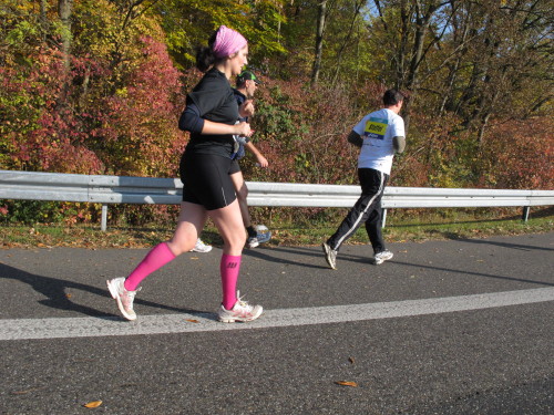 Schön, dass man aufgrund der Geschichte des Frankfurter Marathons die Strecke nach Höchst beibehält. Die Bewohner danken es. Obwohl ich noch nie so weit hinten im Feld war, habe ich hier noch nie so eine Stimmung erlebt. Trommler, Bläser und tausendfachen Applaus. Das gleiche gilt für Nied (km 28), den Nachbarort. Wäre mir langweilig, wäre ich schon weiter. Aber das schlimmste soll ja erst kommen: Die Mainzer Landstraße. Aber, aber. Als geübter Marathoni weiß man doch, dass ein Marathon auch eine mentale Disziplin ist. Wer also auf dem ungefähr 4 km langen schnurgeraden Teilstück Probleme hat, macht was falsch. Ich lasse mich auf Gespräche ein, zeige auf die bunten Sträucher, mache Fotos, danke meiner lieben Lauffreundin Martina, die mir an der Verpflegungsstelle das Wasser reicht und wundere mich, dass ich schon bald den Pumuckl vor seiner Stammkneipe sehe, weil ich jetzt weiß, dass die Durststrecke schon hinter mir liegt.