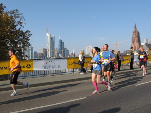Die Frankenallee ist schon sehr belebt und der Blick auf den Messeturm und die umliegenden Hochhäuser phantastisch. So richtig los geht es aber ab dem Platz der Republik, von wo aus wir wieder ins Bankenviertel laufen, in die Innenstadt, zum Opernplatz, Hauptwache, Eschenheimer Turm, usw. Es geht um sieben Ecken, aber man wird getragen. Die Stimmung und die Zuschauer sind der Wahnsinn.