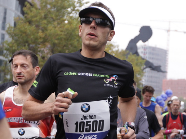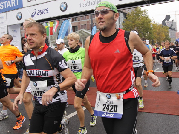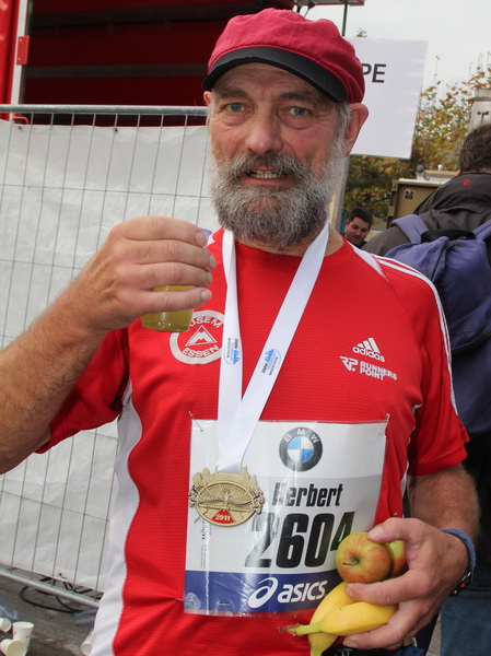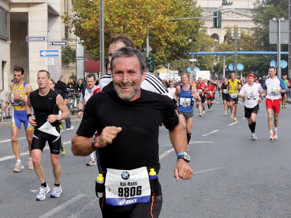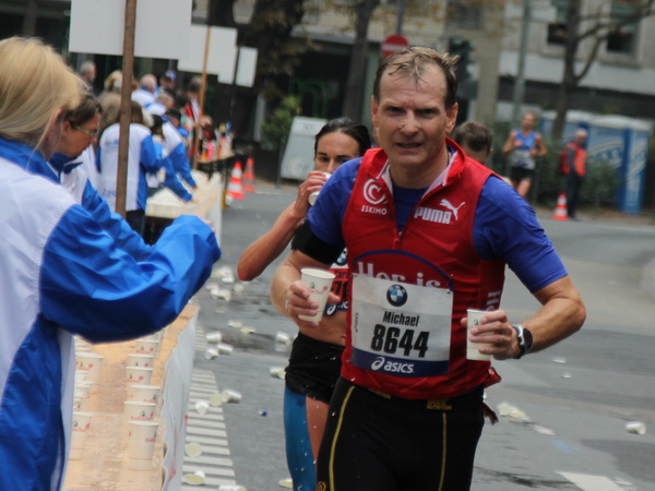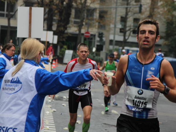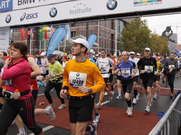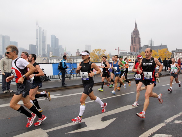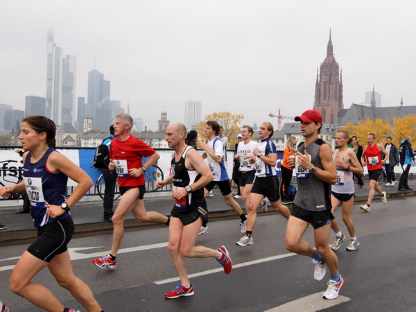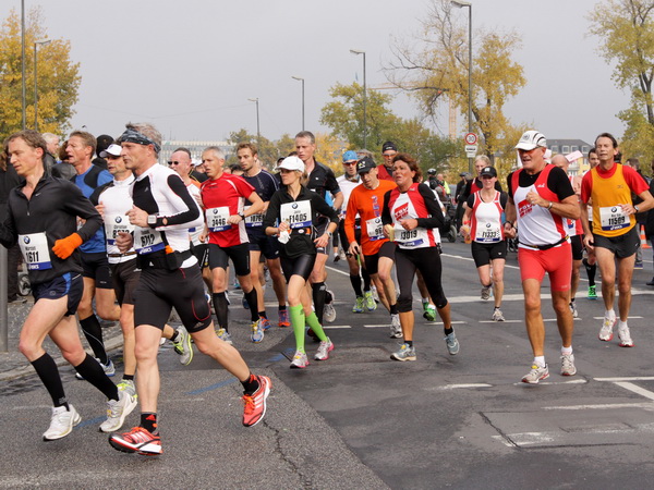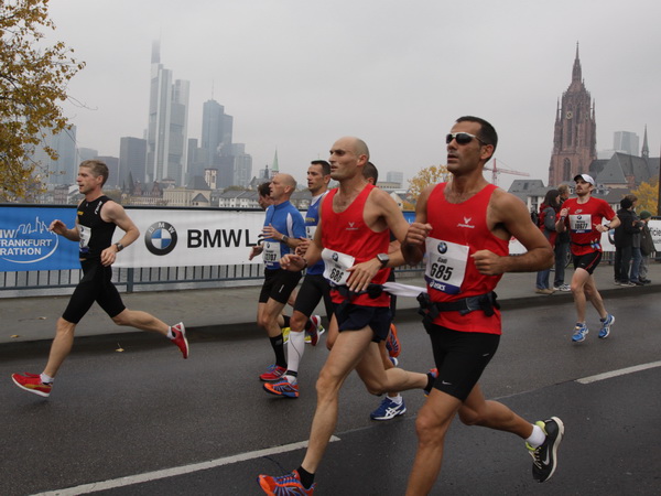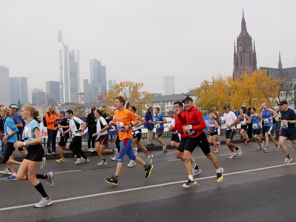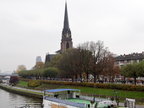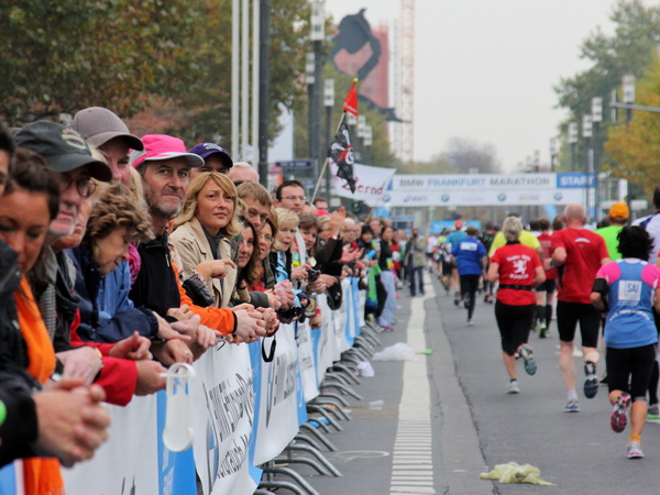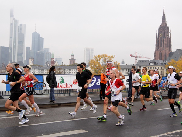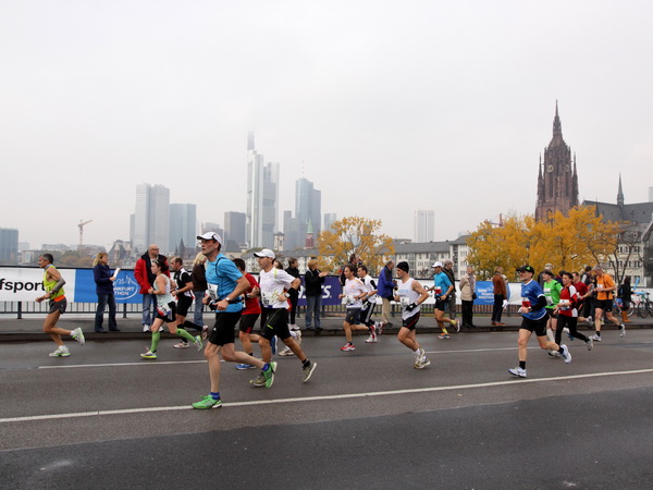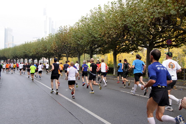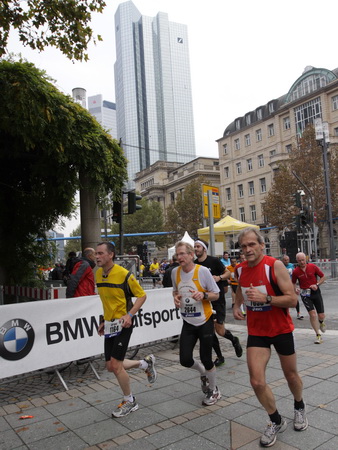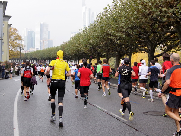 Wenn man von der Autobahn auf die Verwaltungstürme von Niederrad schaut, kann man daran nichts Schönes finden. Läuft man jetzt beim Marathon durch diese Gegend, bekommt man ganz andere Eindrücke. Zwischen den Türmen ist viel Grün und bunt gefärbtes Laub. Trostlos sieht anders aus. Und dann sind da noch die Schrebergärtner, die ihr Frühstück am Marathontag an der Strecke zu sich nehmen. Zu Hausmacher Blutwurst, leicht angeräuchert, sage ich ja, zu Rotwein nein. Gleich kommt die nächste Verpflegungsstelle. Warmer Tee ist mir lieber.