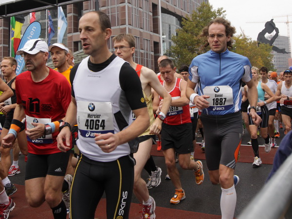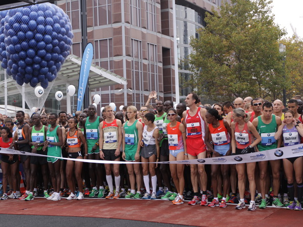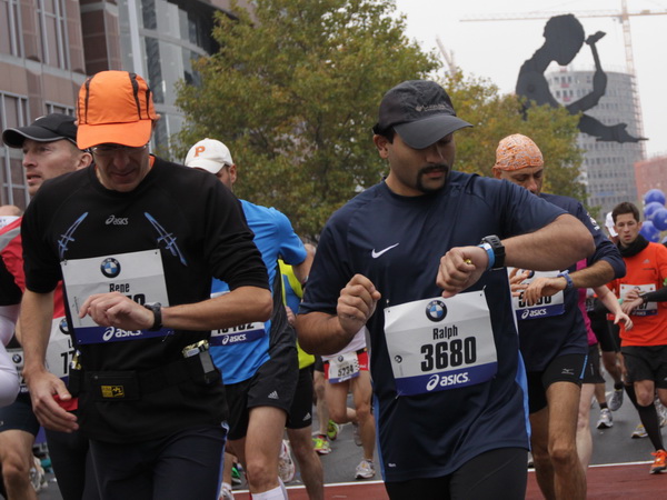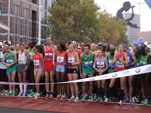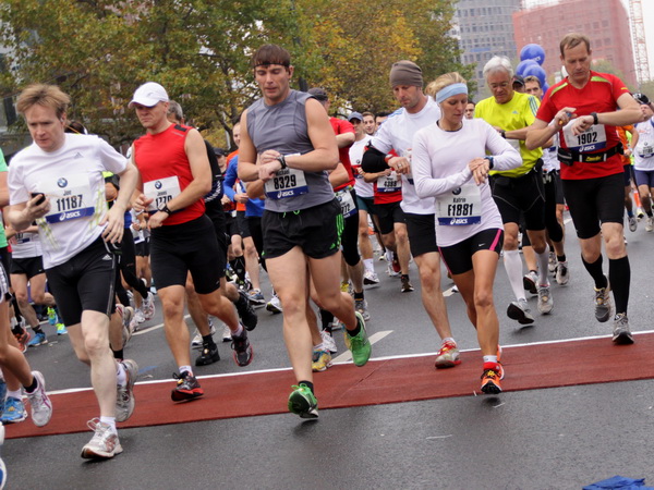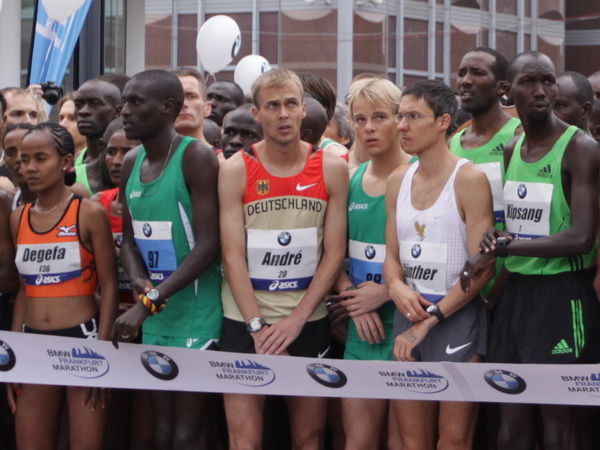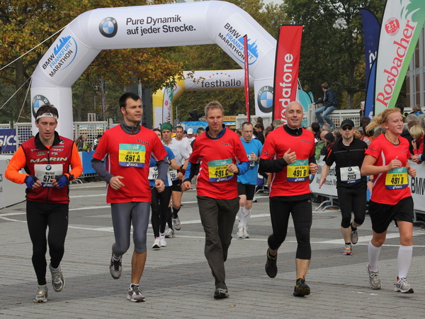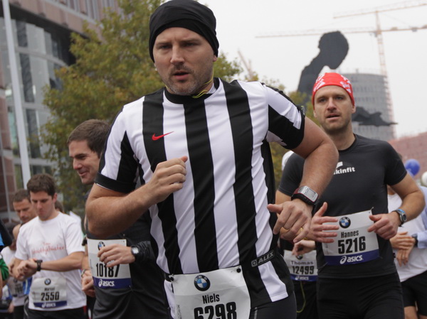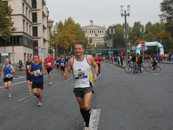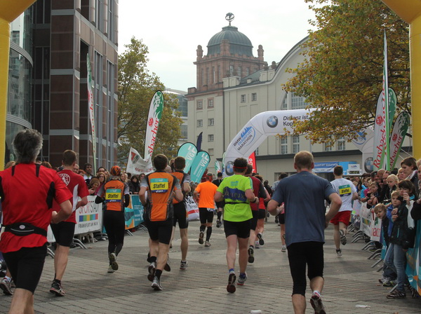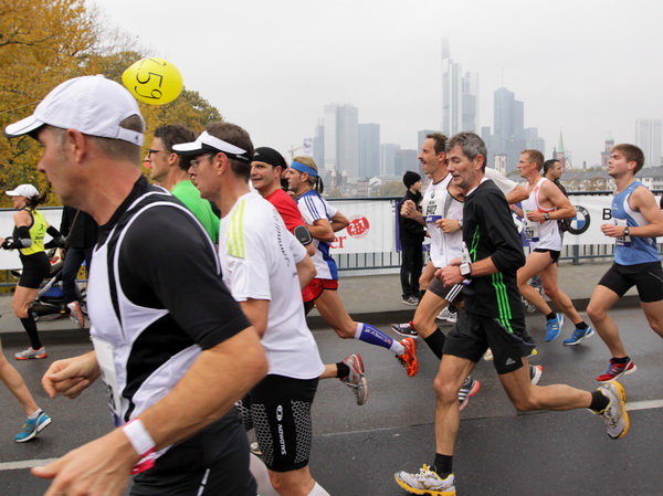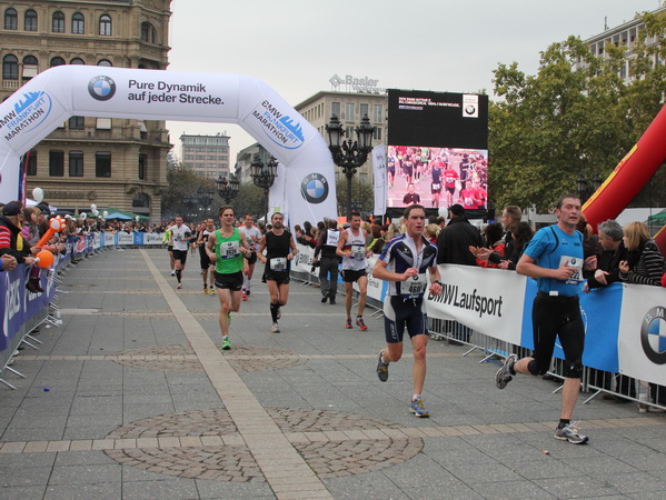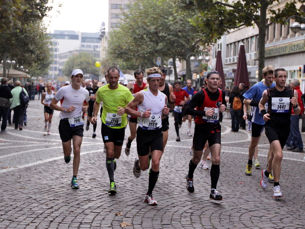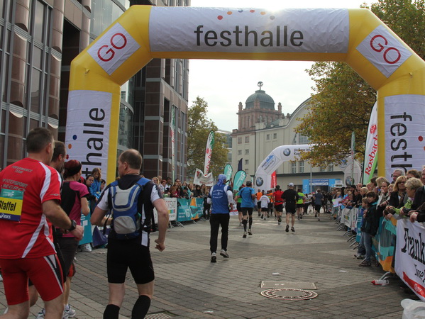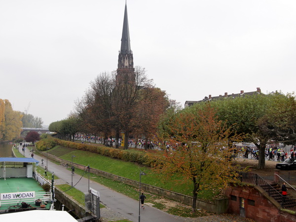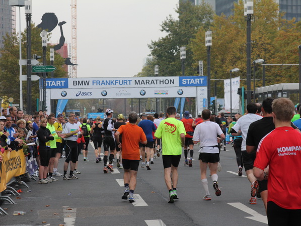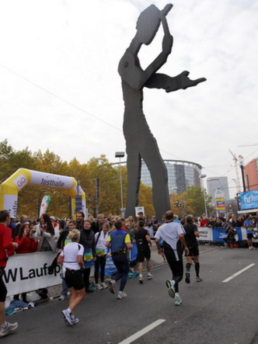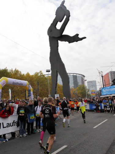 Vier und fünf Musikgruppen haben sich auf der Straße der Leiden postiert, um die Marathonis am Laufen zu halten. Und einmal ist auch das vorbei. Der Pumuckl markiert vor einer Kneipe das Ende der Durststrecke. Von der Frankenallee hat man einen schönen Blick auf den Messeturm. Davor ist eine riesige Baugrube. Hier entsteht das größte Einkaufszentrum Europas.