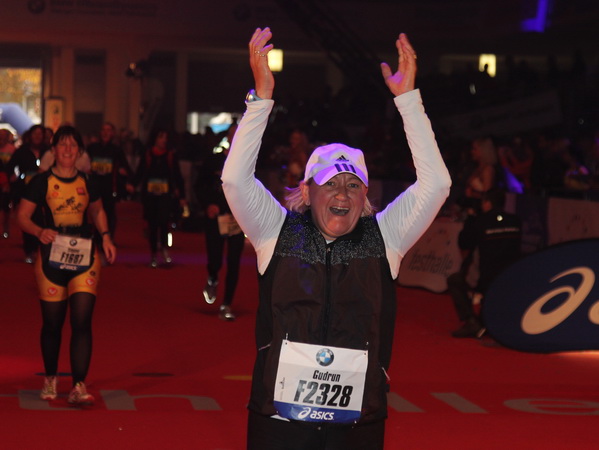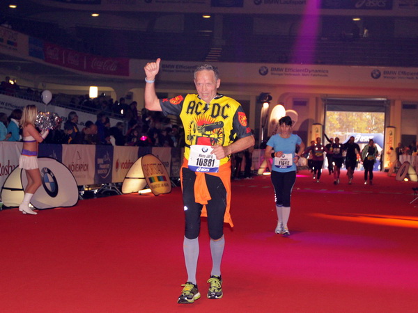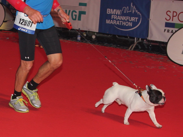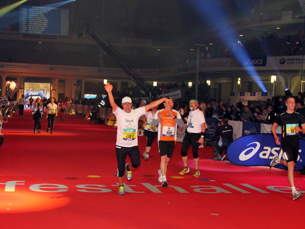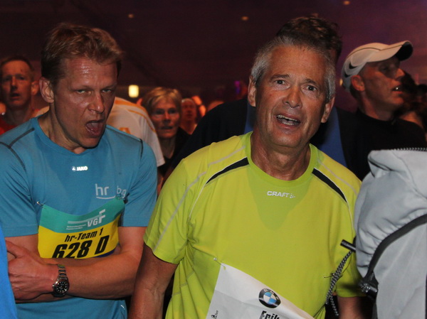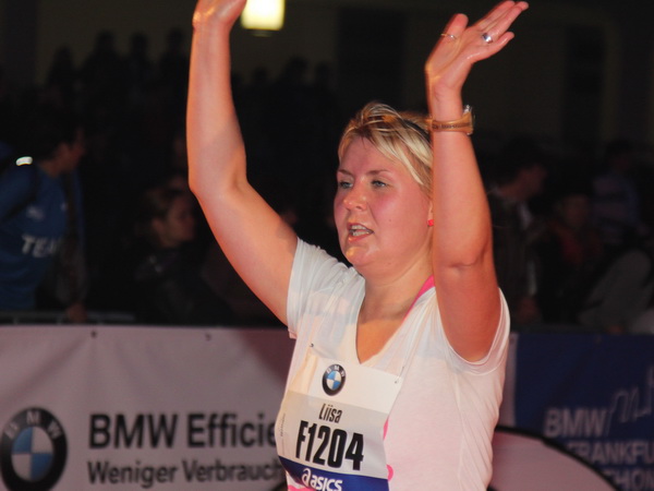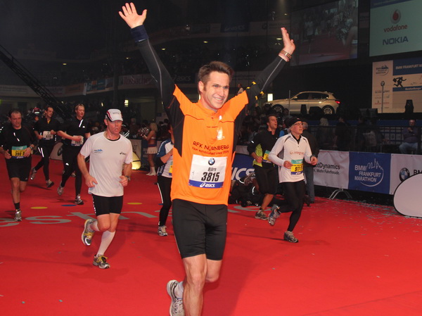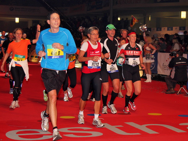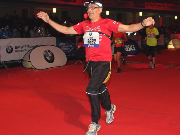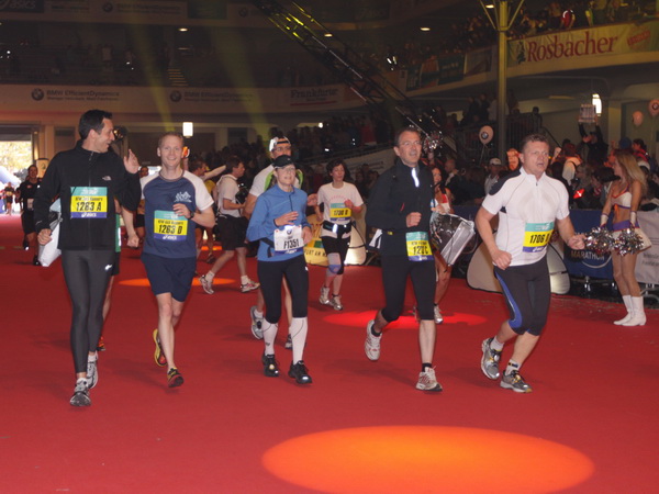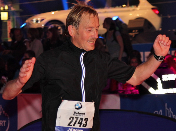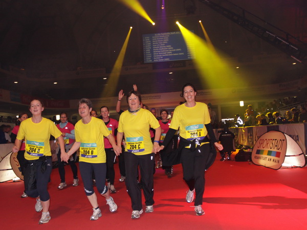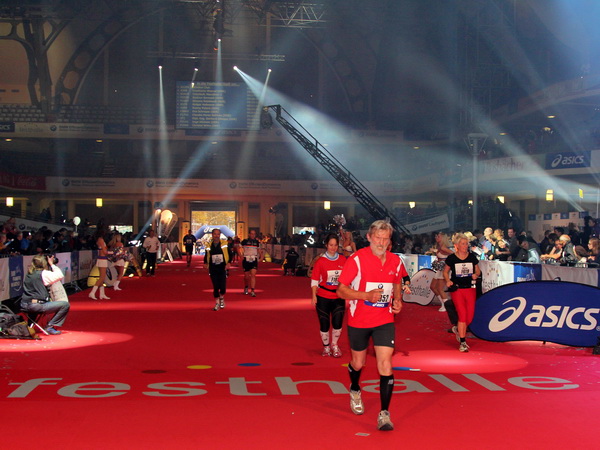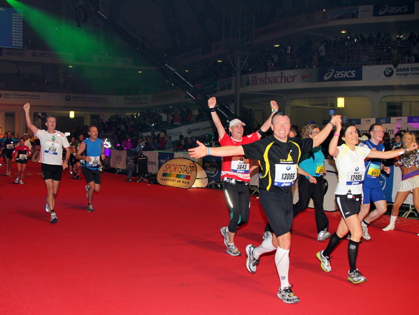 Mir scheint, an jeder Ecke wird getrommelt. Noch einmal der Eschenheimer Turm, die Börse, Freßgass und wieder die Alte Oper. Es wird noch immer gefeiert. Am Platz der Republik dann endlich die Zielgerade. Aber die ist lang. 700 Meter bis zum Messeturm und dem Hammering Man, dann heißt es „ab in die gudd Stubb“. Auf dem roten Teppich geht es in die Festhalle, Applaus, bunte Spots, Jubel. Emotion pur.
