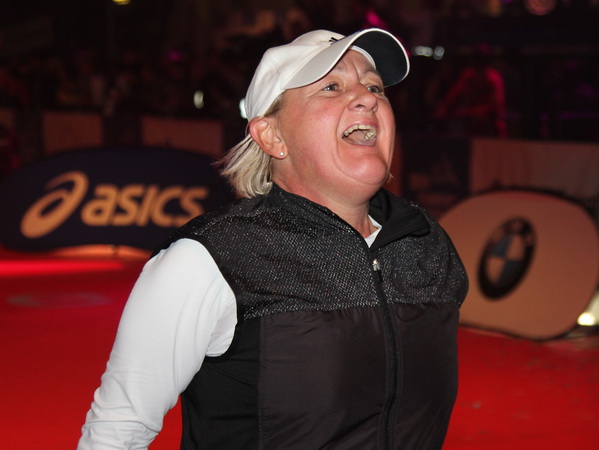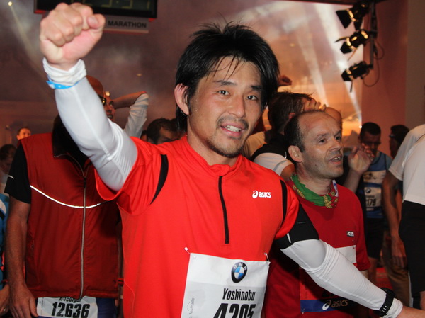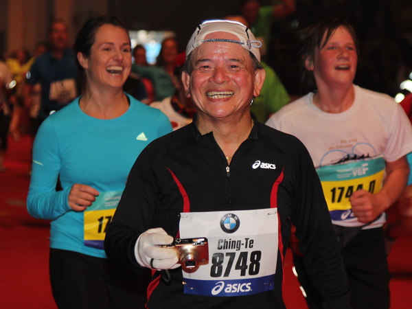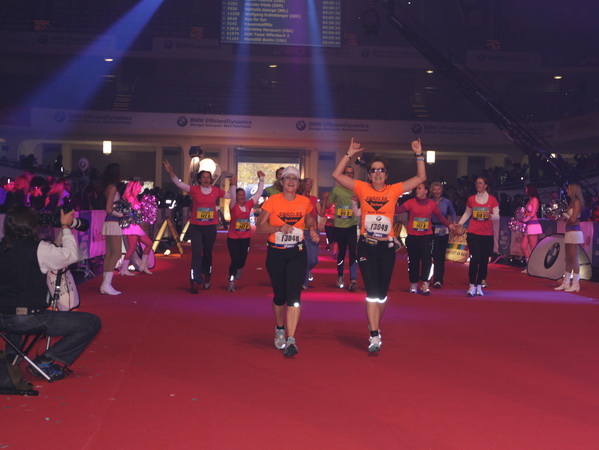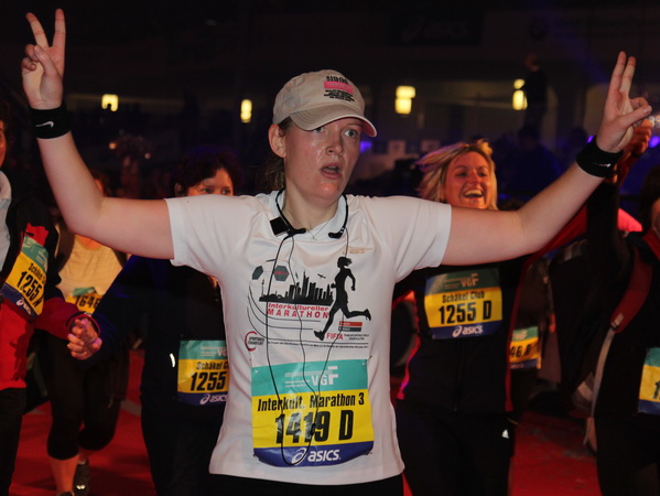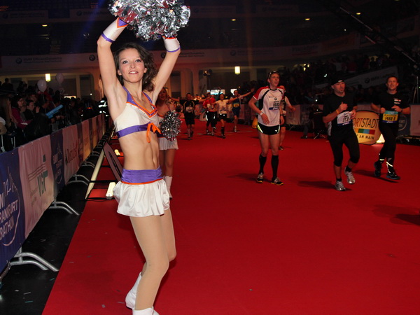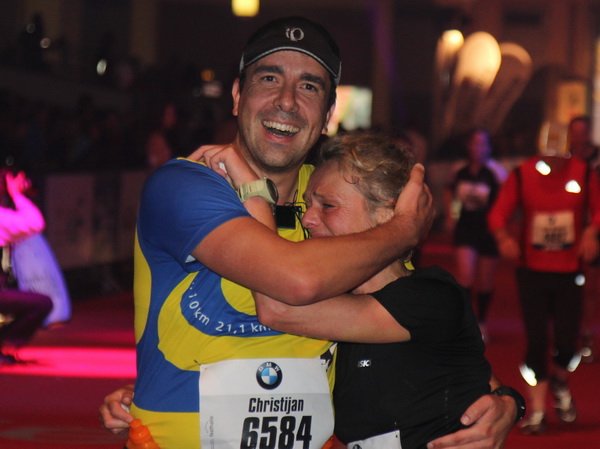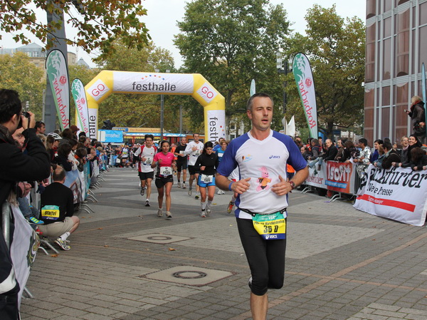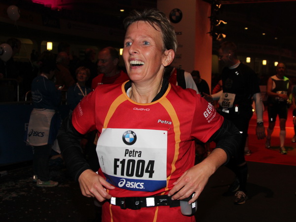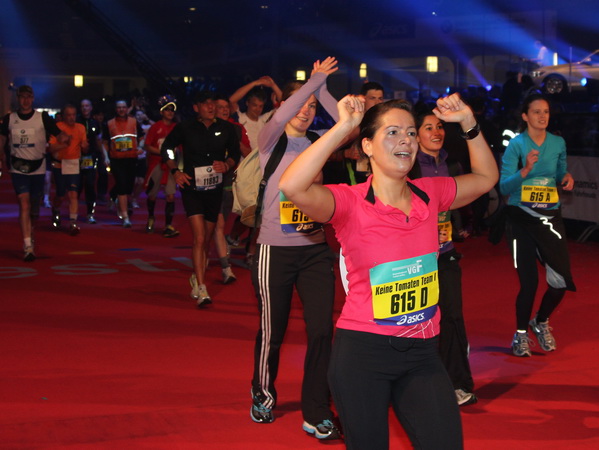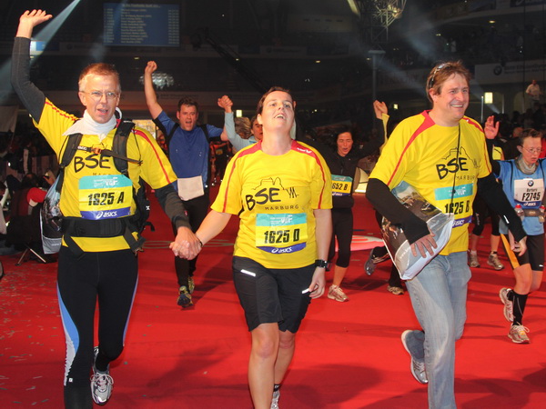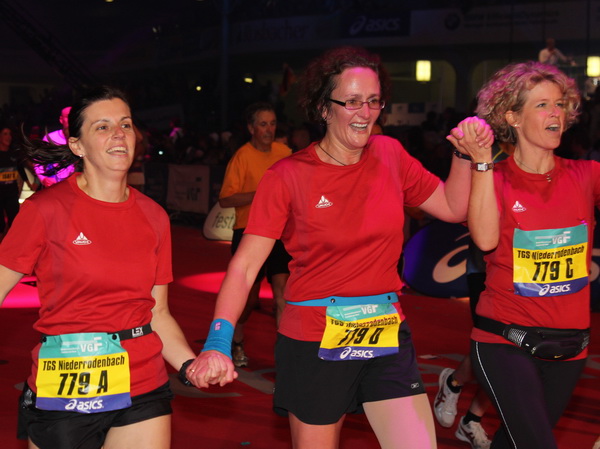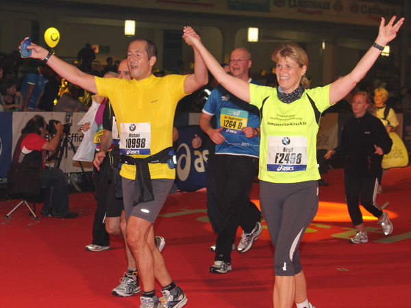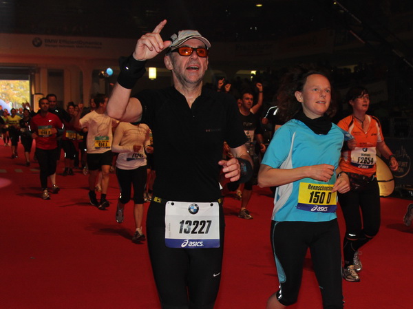 Mir scheint, an jeder Ecke wird getrommelt. Noch einmal der Eschenheimer Turm, die Börse, Freßgass und wieder die Alte Oper. Es wird noch immer gefeiert. Am Platz der Republik dann endlich die Zielgerade. Aber die ist lang. 700 Meter bis zum Messeturm und dem Hammering Man, dann heißt es „ab in die gudd Stubb“. Auf dem roten Teppich geht es in die Festhalle, Applaus, bunte Spots, Jubel. Emotion pur.