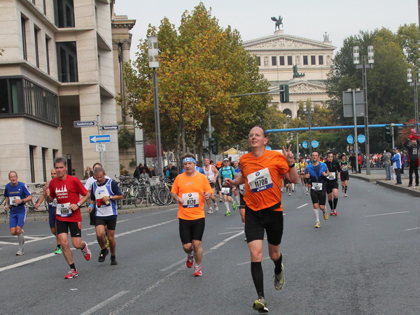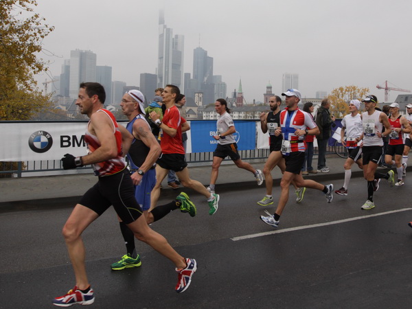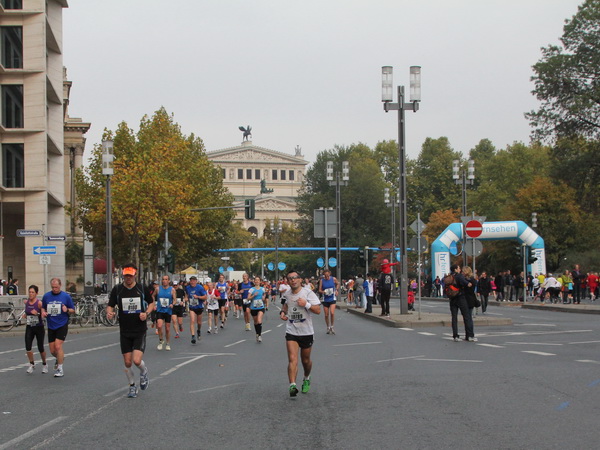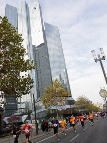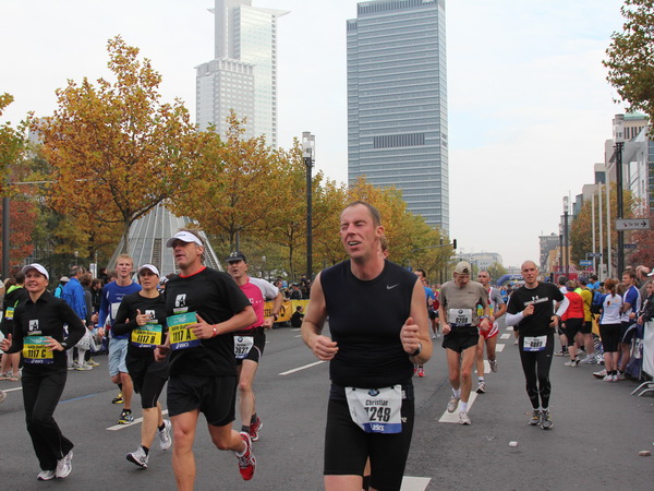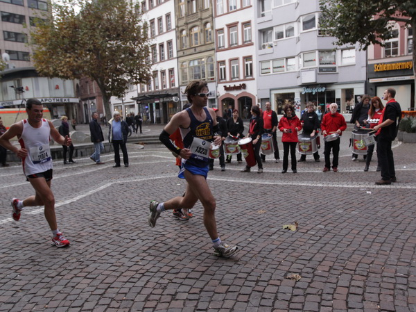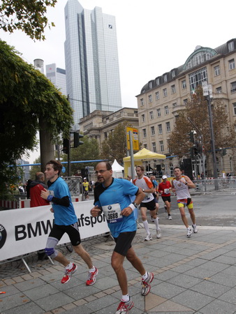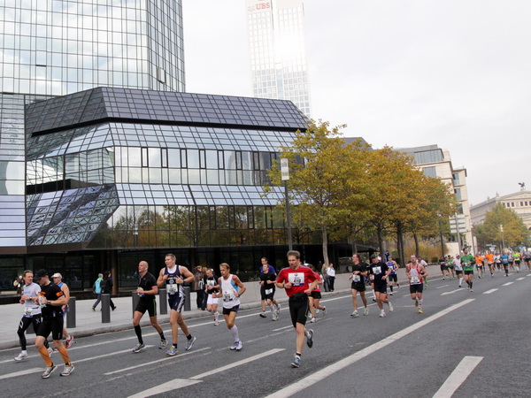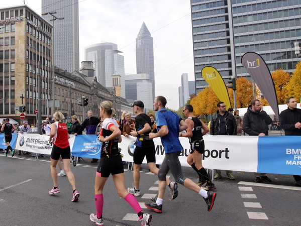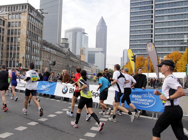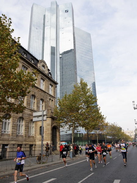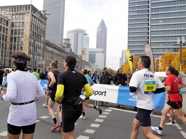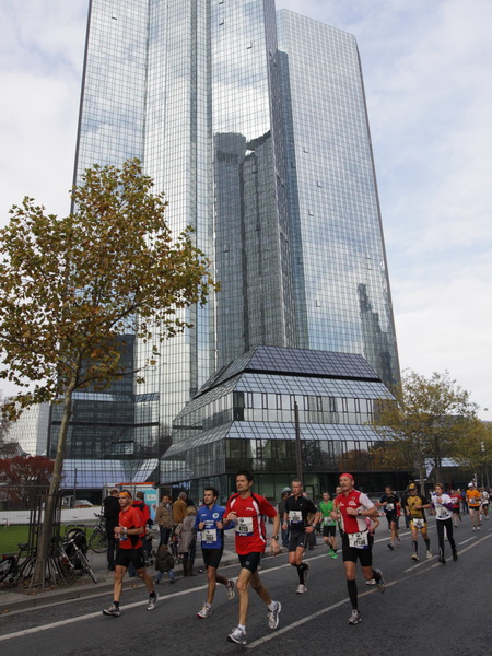 Noch 7 Kilometer. Wieder das Bankenviertel. Die Gegenbahn ist wesentlich belebter als unsere Seite. Links die Krawatte, vor uns die Türme der Deutschen Bank, dann die Alte Oper, dann die EZB. Das Läuferfeld ist lichter, man sieht jetzt das Zeltlager der Protestierer. Bloco X spielen gerade ein melodiöses Stück und dreschen erst wieder auf ihre Trommeln ein, als wir vorbei sind. Das Viertel bebt noch immer. An der Hauptwache erklärt Artur Schmidt den Zuschauern gerade, warum Frauen so gut Marathon laufen.