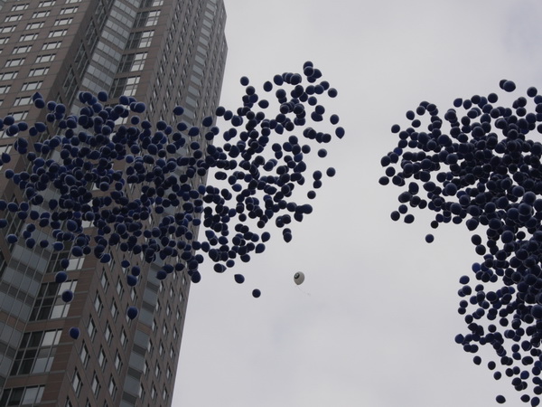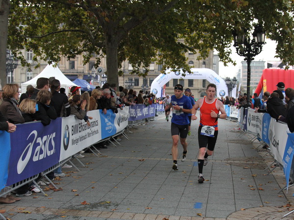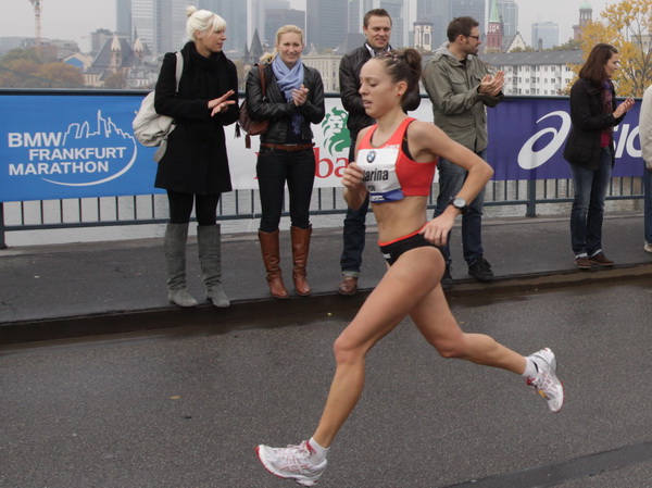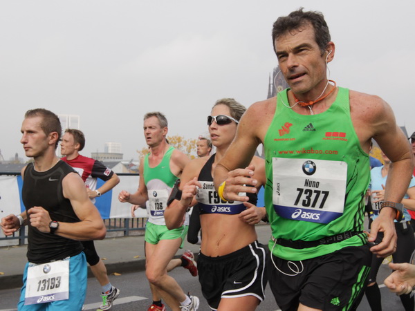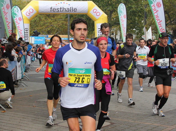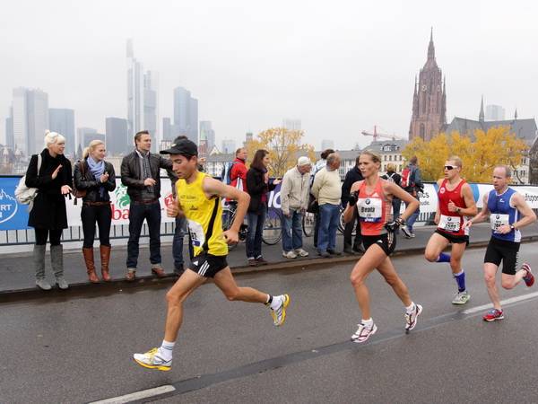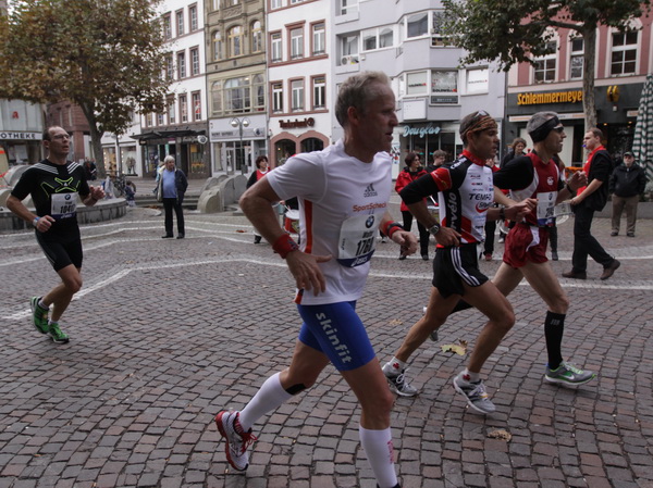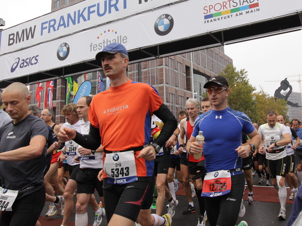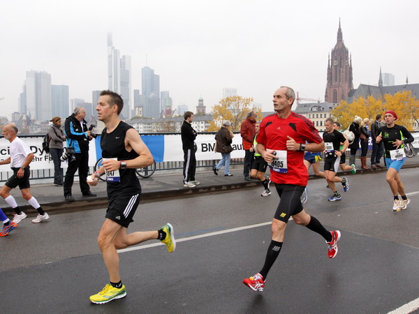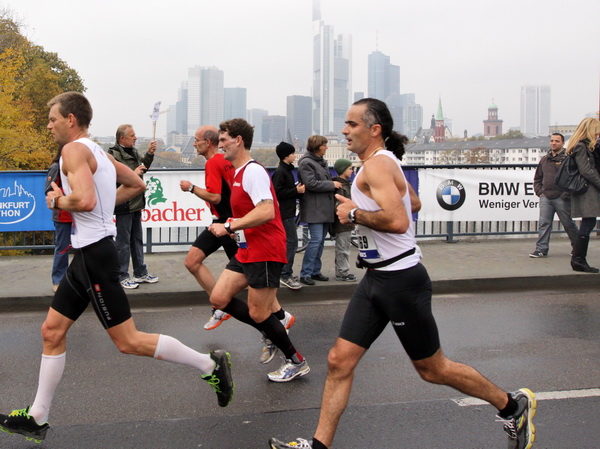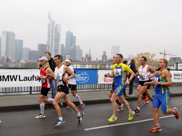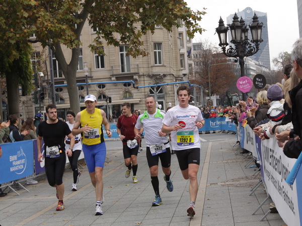 Noch 7 Kilometer. Wieder das Bankenviertel. Die Gegenbahn ist wesentlich belebter als unsere Seite. Links die Krawatte, vor uns die Türme der Deutschen Bank, dann die Alte Oper, dann die EZB. Das Läuferfeld ist lichter, man sieht jetzt das Zeltlager der Protestierer. Bloco X spielen gerade ein melodiöses Stück und dreschen erst wieder auf ihre Trommeln ein, als wir vorbei sind. Das Viertel bebt noch immer. An der Hauptwache erklärt Artur Schmidt den Zuschauern gerade, warum Frauen so gut Marathon laufen.