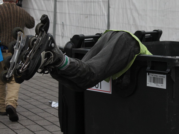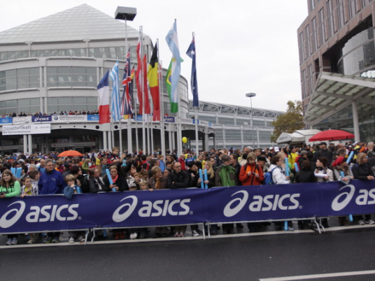 Durch’s Tor beim Frauenhof geht jedenfalls nichts. Das ist wegen einer Baustelle gesperrt, Umleitung nach Niederrad. Endlich wieder Trommler, Bloco Baiano nennen sie sich. Durch die Unterführung und gleich sind wir wieder auf der bekannten Strecke. Ich werde unruhig, schaue zur Uhr. Nein, meine Zeit interessiert mich nicht. Aber die Ersten sind im Ziel. Ich will wissen, ob es geklappt hat mit dem Weltrekord. Martin Westermann moderiert beim Astro Park, der weiß bestimmt Bescheid. Kurze Frage, knappe Antwort, langes Gesicht. Einziger Kommentar: „Scheiße!“ 4 Sekunden. Eins, zwei, drei, vier – auf 42,195 km! Um vier Sekunden den Weltrekord verpasst. Sport ist grausam. „Lass uns aufhören“, meint Heike.