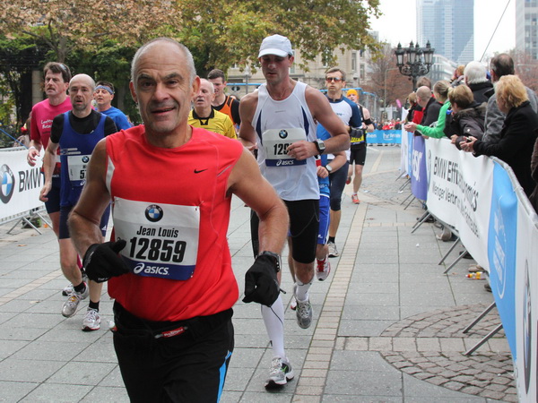 Km 30, jetzt kommt der Streckenabschnitt, wegen dem viele Läufer auf die Wallfahrt nach Höchst verzichten könnten. Die Mainzer Landstraße, das sind 4 schnurgerade Kilometer ohne großartige optische Reize. Mentale Stärke ist hier gefordert, oder Zuspruch. Helga hat Glück. Sie läuft heute ihren ersten Marathon. Heike hat schon etwas mehr Erfahrung. Sie legt den Arm um sie und redet pausenlos auf sie ein. „Nicht aufgeben“, „Denk an das gute Gefühl, wenn Du es geschafft hast“, immer mehr solche Worte fallen ihr für die Freundin ein. Helga nickt stumm und läuft wieder 100 Meter. Von Krämpfen geplagte Kameraden machen Dehnübungen. Keiner gibt auf. Dann kommt Gerd, der rüstige M75er, Markenzeichen 100MC-Shirt und rote Handschuhe. Ob der schon 100 Marathons hat? Einer fragt. Gerd sagt seine Zahl (es sind bald 400), es ist still. Man sieht ihm die Jahre nicht an und nicht die Anstrengung. Jeder und jede reißt sich zusammen. Es geht weiter.