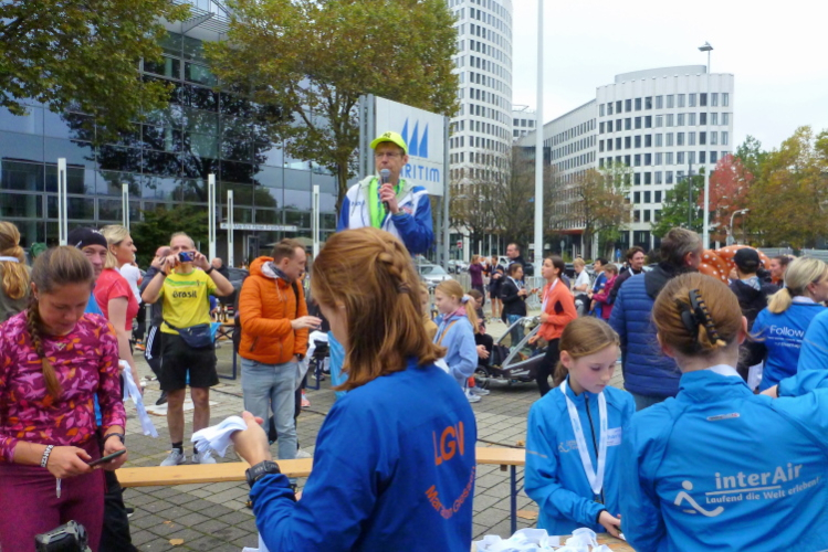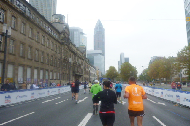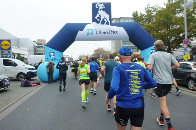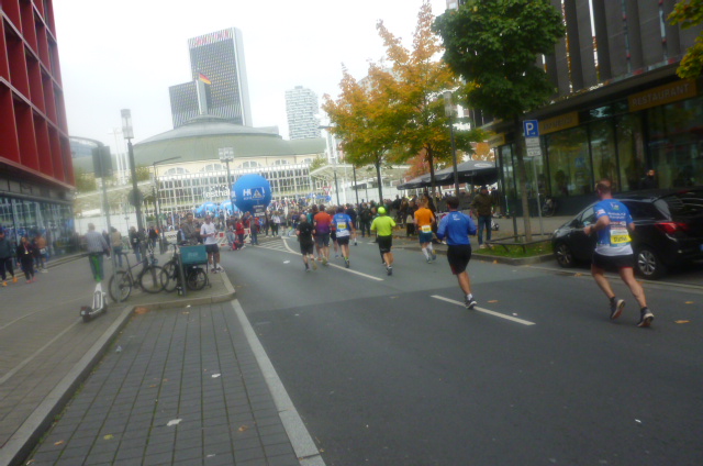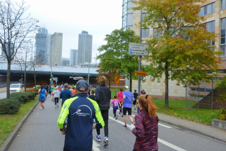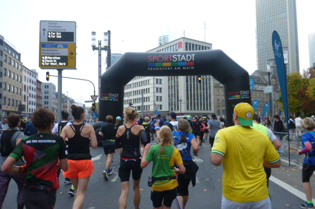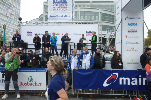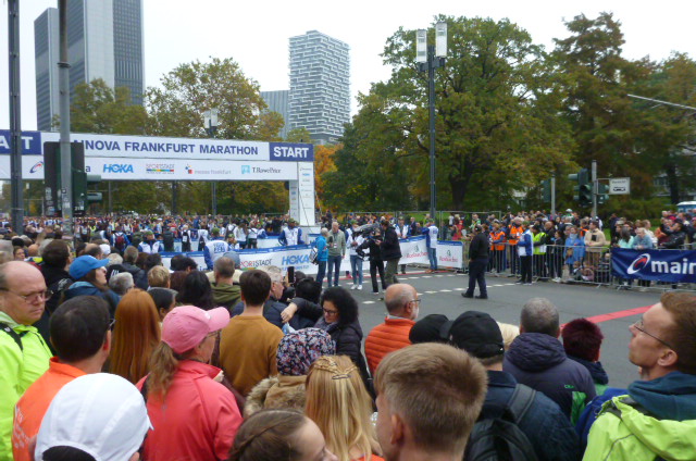 Bevor es losgeht, lauschen wir vor der Halle noch den Interviews mit dem Renndirektor Jo Schindler, dem Frankfurter OB, Mike Josef, und schließlich dem Vorstandsvorsitzenden des Hauptsponsors Mainova. Den Start der ersten Welle mit den Topfavoriten verfolge ich aus der dritten Reihe am Rand nach etwa fünfzig Metern Laufstrecke. Im Starterfeld sind zahlreiche Weltklasse-Läufer: Allein sieben Athleten mit Bestzeiten von unter 2:07 Stunden kündigt der Veranstalter an. Bei günstigen Witterungsbedingungen könnte ein neuer Streckenrekord drin sein.