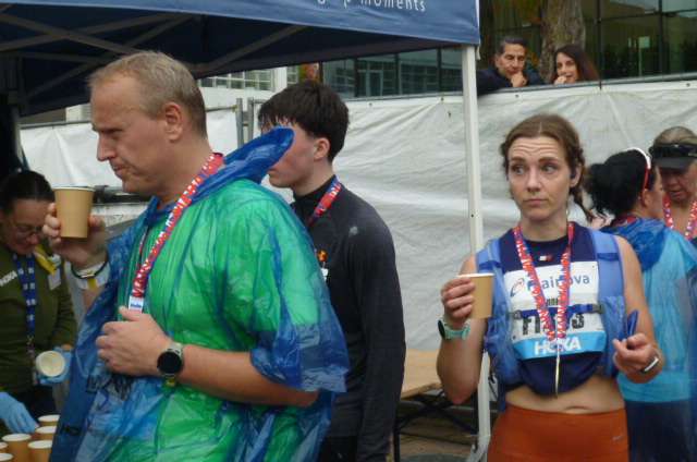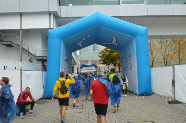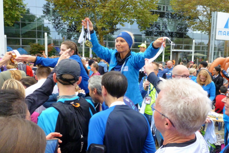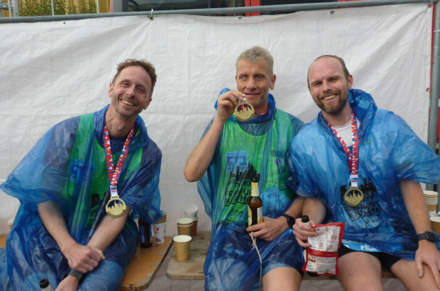 Nichtsahnend schieße ich noch Foto um Foto, bevor ich sanft, aber bestimmt hinauskomplimentiert werde. Selber noch erstaunlich dynamisch, kann ich die Treppen bergab ins Freie problemlos bewältigen, was einigen Leidensgenossen sichtlich schwerfällt. Doch die werden, genauso wie ich, hocherfreut sein, denn nach dem wichtigen, warmhaltenden Poncho gibt’s die wohlverdiente Medaille. Und was für eine! Die gehört mit Sicherheit zu den fünf schönsten, die ich im Laufe der vergangenen 23 Jahre einsammeln konnte. Und das sind viele, sehr viele.