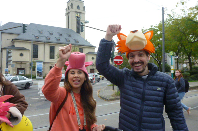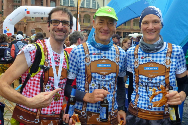 Hinterher gibt’s auch für uns endlich die hochbegehrte Brezelmedaille (Metall) und ihre Verwandte aus Laugenteig zum Reinbeißen. Und noch Getränke bis zum Abwinken. Klasse! Natürlich werden es bis zum Abend wieder einmal viel zu viele Lauf- und Geh-km werden, ehe wir die Beine nach dem Besuch der berühmten Sachsenhäuser Ebbelwoi-Wirtschaft Gemaltes Haus erschöpft ausstrecken.