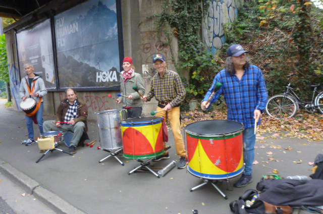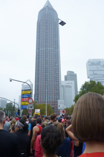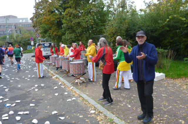 Eine erste, interessante Begegnungsstrecke bietet man uns auf dem ersten km. Am Anfang und am Ende erinnern uns die beeindruckenden Hochhausbauten daran, warum die Bankencity mit einem Augenzwinkern in Anspielung auf New York City gerne auch Mainhattan genannt wird. Im Hochhaus der ehemaligen Dresdner Bank, heute Commerzbank, nahm vor vierzig Jahren auf einem Bitsy-Schreibsystem von TA meine Diplomarbeit Gestalt an. Vor dem Senckenbergmuseum, in dem ich staunend zahllose Stunden verbracht habe, grüßt ein Dino. Kaum jemand schenkt ihm Aufmerksamkeit. Eine erste Percussionsband von rund dreißig lautstarken Unterstützern macht uns Beine.