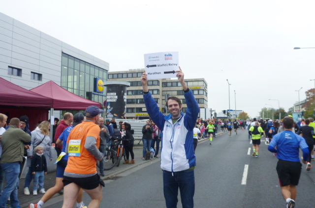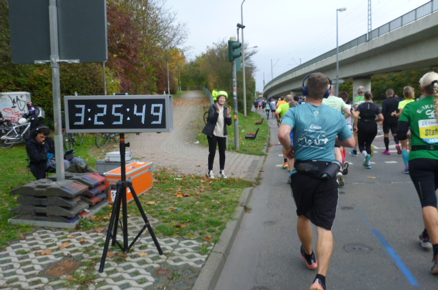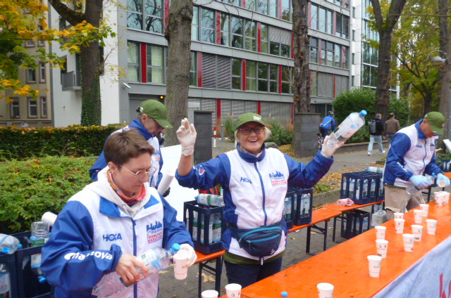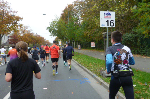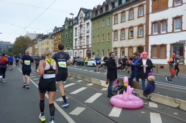Auf der Bockenheimer Landstraße erwartet mich an km 5 mit dem ersten, vom Lauftreff Hanau/Bruchköbel betriebenen VP auch gleich der erste Höhepunkt. Allerdings weniger des Flüssigkeitsnachschubs, sondern der freiwilligen Helfer wegen. Meine große kleine Schwester samt Gatten unterstützt hier seit vielen Jahren und in diesem Jahr ist auch erstmals meine deutlich bessere Hälfte mit von der Partie. Sie genießt es sehr, einen großen Lauf auch mal aus dieser Perspektive zu erleben. Die insgesamt 87 (!) hier involvierten Helfer unterstützen rund 14.000 gemeldete Marathonis plus ungezählte Staffeln, die nach der zweiten Welle gestartet wurden. Man bietet uns nicht nur hier eine super Verpflegung an sehr vielen Stellen. Wobei der ganz große Durst bei mir nicht aufkommen wird, denn entgegen der Wettervorhersage wird es den ganzen Tag bedeckt bleiben. Und so fühle ich mich mit Langarm- und T-Shirt doch richtig bekleidet.