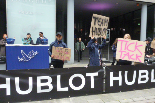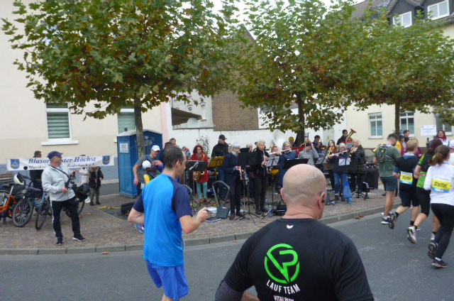 Wieder in Hibbdebach sind wir zunächst in Höchst, wo der Marathon seinen Ursprung hatte. Einige Bands helfen uns auch aus diesem Stadtteil. Einem Heerlager gleich liegt links ein weiterer Staffelwechsel, die man allesamt sehr vernünftig abseits der Hauptstrecke gelegt hat. Allerdings bemerke ich natürlich, daß es die schnellen Staffeln echt schwer haben, sich durchzukämpfen. Insbesondere fiel mir das am Anfang auf, denn zahlreiche Laufquartette haben vermutlich ihre Stärksten an den Anfang gestellt, deren Herausforderung es war, sich durch das dichte Feld der langsamen Marathoner durchzupflügen.