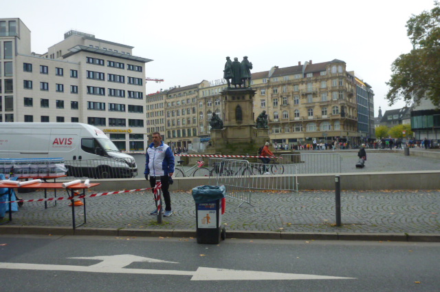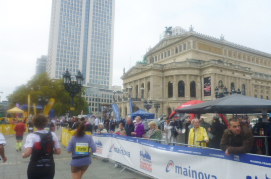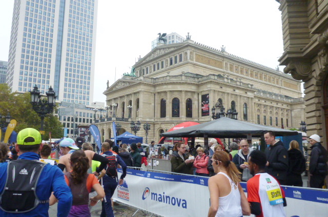Ich nähere mich erstmals dem Opernplatz mit der alten Oper, die zu meiner Schulzeit jahrzehntelang eine eingezäunte Kriegsruine gewesen war. Nach langer Diskussion wurden die verbliebenen Außenmauern wieder mit Leben gefüllt, ein hochattraktives Gebäude mit ebensolchem Vorplatz ist heute das Resultat. „Und hier ist der Wolfgang von Marathon4you.de! Wir freuen uns schon auf seinen Bericht“, klärt Sven auf und raunt mir zu: „Wir sehen uns später, ich hab’s nicht vergessen!“ Ja, was denn? Fragen über Fragen.