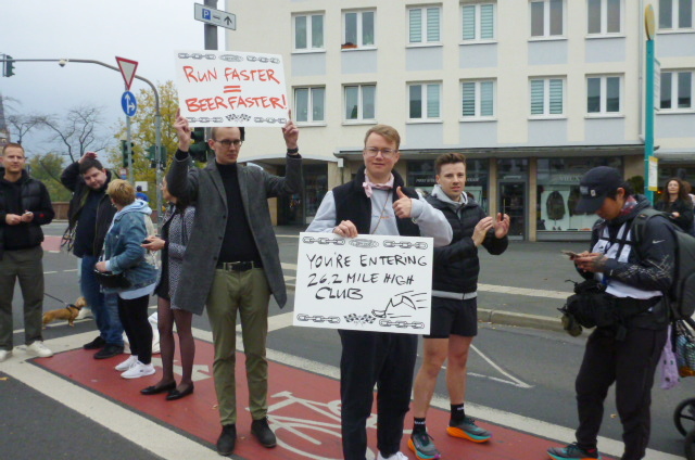 Tja, und jetzt seid Ihr an der Reihe, die Ihr unser Portal schon lange kennt: Bier und Frankfurt, war da nicht was? Oder wer? Ich jedenfalls mustere jedes Gesicht zwischen km 32 und 33, selbstverständlich sehe ich ihn sofort. Verabredungsgemäß – natürlich ist das kein Zufall! – steht da unser Joe Kelbel, ehemals aktivster Laufreporter der Welt und eines der Gesichter von Marathon4you. Strahlt von einem Ohr zum anderen und öffnet seinen Rucksack. Ah, zisch und klack und weg! So klang es jahrelang in der Kultserie „Die Camper“, ähnliche Geräusche ertönen am Rand der Mainzer Straße, während die 4:29er Zug- und Bremsläufer grinsend und verstehend vorbeiziehen. Egal, die Zeit wird sich jetzt genommen. „Du kannst den Rest auch mitnehmen!“, meint mein persönlicher Unterstützer, mault aber auch nicht, als ich ihm diesen dalasse. Er ist mit Sicherheit nicht verkommen. Der Joe natürlich auch nicht, dem als nicht mehr laufen Könnender das Herz beim Anblick der viele tausend Vorbeiziehenden bluten muß.
