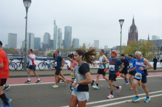 Solche Begegnungen gehen ans Herz und helfen bei der Bewältigung eher eintöniger Strecken. Die Skyline wieder im Blick geht es auf die letzten km, die – nicht wegen des Gerstensafts! – schwerfallen. Gerne hätte ich die 4:29er noch eingeholt, aber dafür hätte ich die letzten Körner zusammenkratzen müssen. Also abhaken.