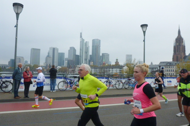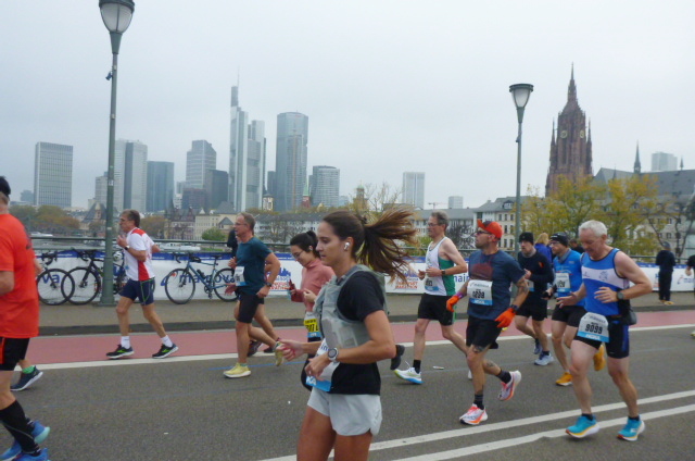 Wieder befinden wir uns am Eschenheimer Turm, verabschieden uns dann aber nach 13 km nach Dribbdebach, ne Kölsche hätt jesoht op de schäl Sick. Der Blick von der Alten Brücke auf die Skyline inkl. des Kaiserdoms ist beeindruckend, weshalb sich hier auch das beliebteste Fotomotiv des Laufs befindet. Das Sachsenhäuser Ufer und der Schaumainkai bieten viel innerstädtisches Grün. Hinter dem Eisernen Steg verabschieden wir uns vom freundlichen Frankfurter Gewässer und ziehen westwärts. Beim Betrachten des Streckenplans sticht mir die Vergleichbarkeit mit Paris und seinem Lauf an der Seine ins Auge.