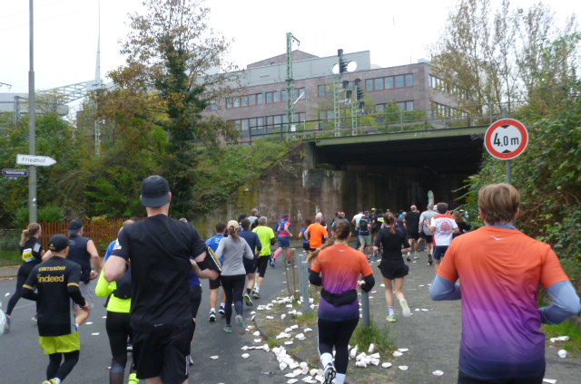 Km 30 erreiche ich nach 3:11 Std., er markiert zwischen Nied und Griesheim den Beginn der von Vielen als endlos empfundenen Mainzer Straße. Bei meinem hiesigen Ersteinsatz 2004 waren es nach meiner Erinnerung die km 32 – 37 gewesen, die mir hinsichtlich der angestrebten 3:30 den Zahn endgültig zogen. Heute nicht. Ok, natürlich bin ich viel langsamer als damals geworden, aber auch erfahrener. Da ich mit mir selber sehr gut klarkomme, meinen Gedanken nachhänge und die Umgebung aufmerksam scanne (nicht zuletzt wegen der potentiellen Fotomotive), hat die Langeweile keine Chance.
