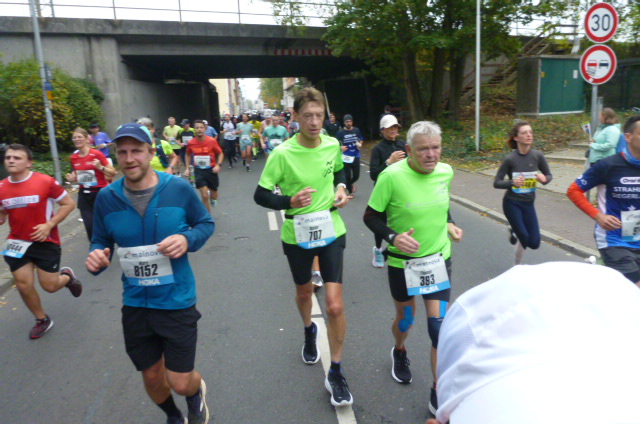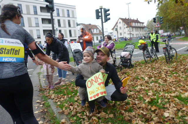 So reiht sich km an km. In Goldstein, das sich Niederrad anschließt, hämmert uns der lokale Moderator ein, daß dies der schönste Stadtteil sei, an zahlreichen Stellen werden kleine Feste gefeiert. Offensichtlich auch feste gefeiert. Wie überhaupt der Zuschauerzuspruch insgesamt sehr gut ist, wir werden wohlwollend und nett begleitet. Halbzeit ist nach netto 2:15 Std., das passt.