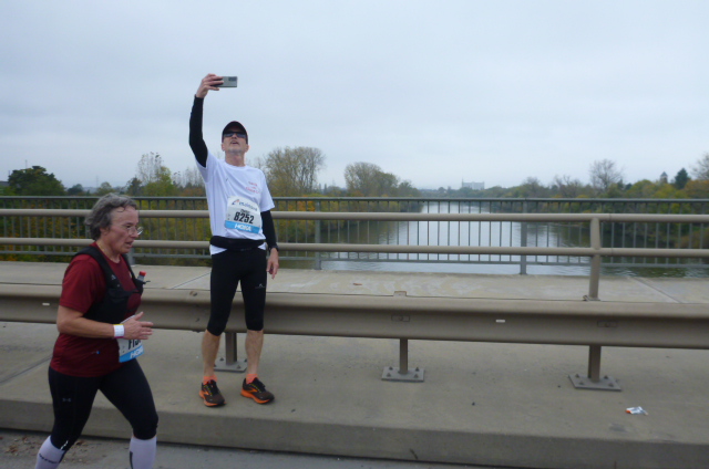 Schon länger sind mir die 4:29er Pacer auf den Fersen, überholen schon mal zu meinem Leidwesen, denn davor läuft’s sich besser als im Pulk. „Noch 21 km hoffen und beten!“ verkündet das Transparent vor der evangelischen Kirche. Ob’s der Herr alleine richten kann? Ein wenig laafe müssen wir schon selber. U.a. nette Fachwerkhäuser erfreuen uns in Schwanheim, bevor nach km 23 der leichte Anstieg zur Schwanheimer Brücke kommt. Ja, wirklich, es sind zwar offiziell nur 27,8 Höhenmeter, aber einige davon sind optisch tatsächlich wahrzunehmen. Wobei ich sagen muß, daß Strava deren gute 80 auswirft, und das nicht nur bei mir. Was soll’s? So oder so ist die Strecke bretteben.