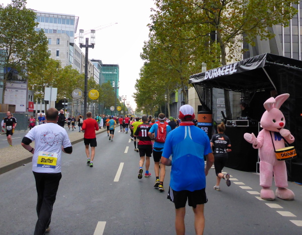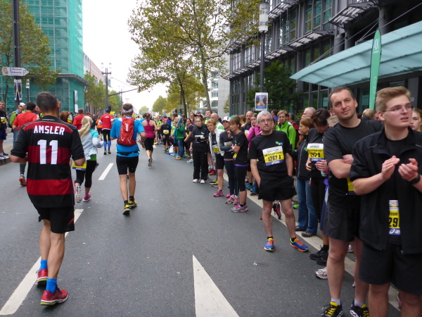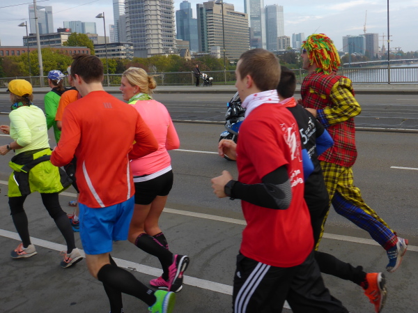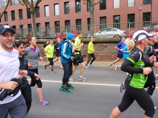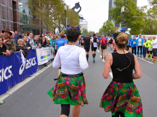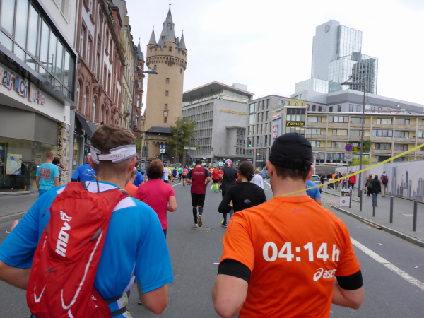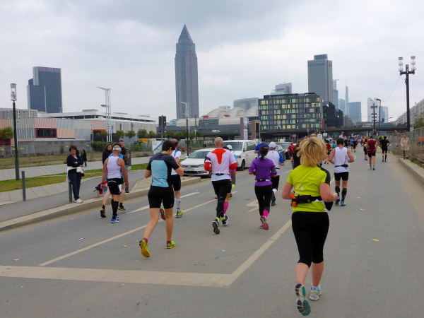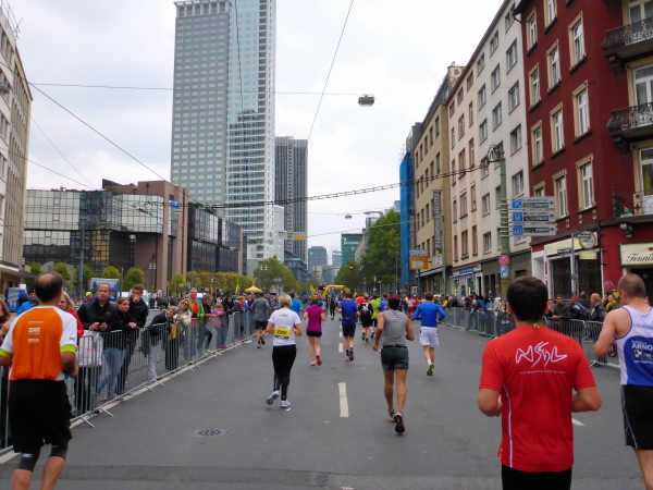 Auf der Oeserstrasse, der alten Römerstrasse, die in Frankfurt Heerstrasse heisst, wird nochmal Stimmung getankt, dann geht es auf die Mainzer Landstrasse (km 30), den Schrecken aller Frankfurt-Läufer. Aber nicht dieses Jahr! Alle 333 Meter gibt es Mucke. Die Strecke ist zum Stimmungsmittelpunkt geworden. Kein Vergleich zu früheren Jahren. Frei laufen und genießen. Bier- und Fresstände, Stimmung, Weltklasse. Der Duft von Gegrilltem! Würstchen, Hähnchen, ooooh ich könnte alles essen!