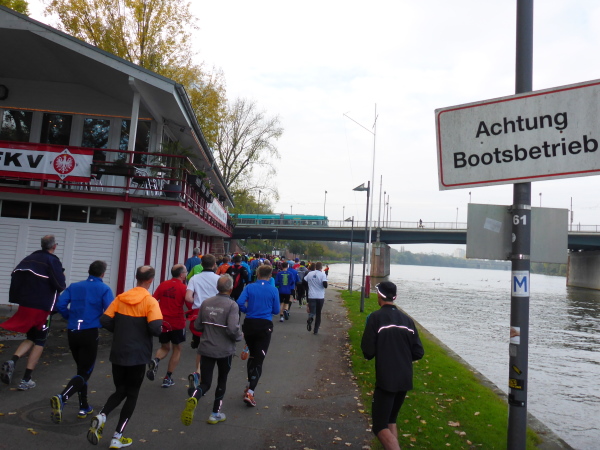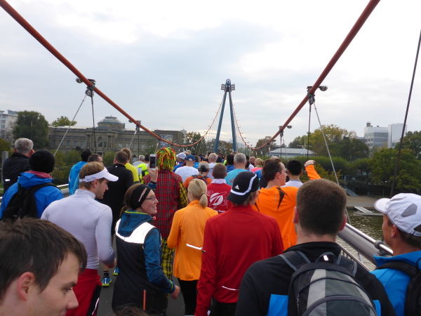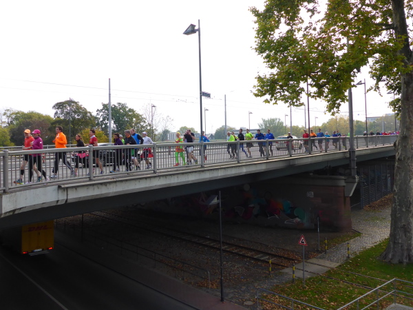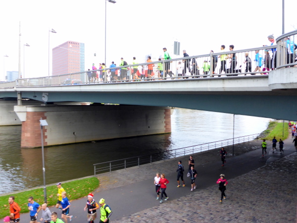 Am Schwanheimer Ufer, Kreuzung Eifelstrasse ist von der alten Brücke (1907) nur noch das Brückenhaus erhalten. Wir laufen 600 Meter weiter auf die neue Brücke von 1963. Dort feuert uns Moderator Markus Bourcarde an. Obwohl, so richtig feuert der nicht. Lieber Markus, nächstes Jahr feuerst Du wie die blonde Fotografin hinter Dir, die mich geheiratet hätte, wenn ich langsamer gewesen wäre!