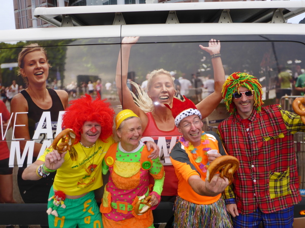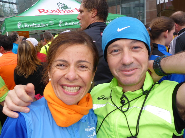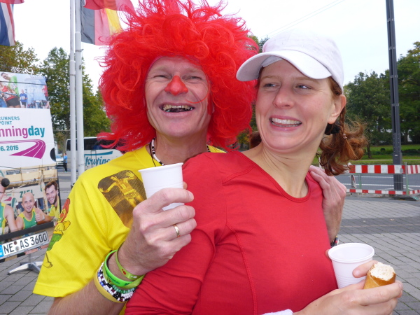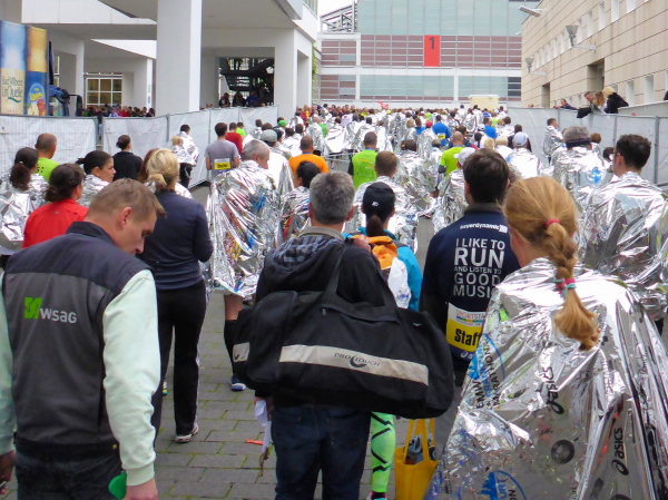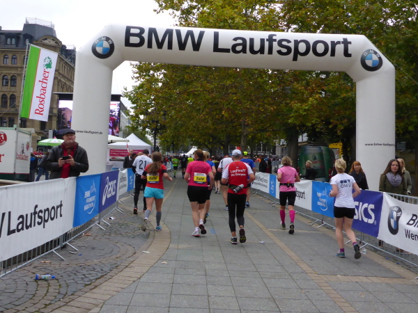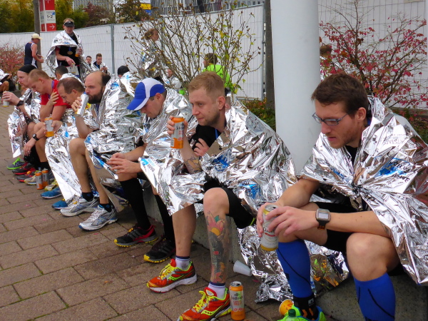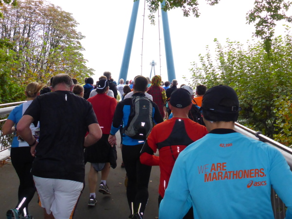 Direkt am Ufer ist der Staffelwechselpunkt. Ich kenne keinen Marathon, der so genial das Problem mit Staffelläufern gelöst hat: Da stehen Ordner, trennen die Staffelläufer von den Marathonläufern auf angenehme Weise. Kein Stau, keine Anschlussläufer, die sabbernd die Laufstrecke blockieren. Ganz, ganz großes Lob an die Orga.