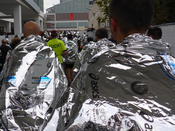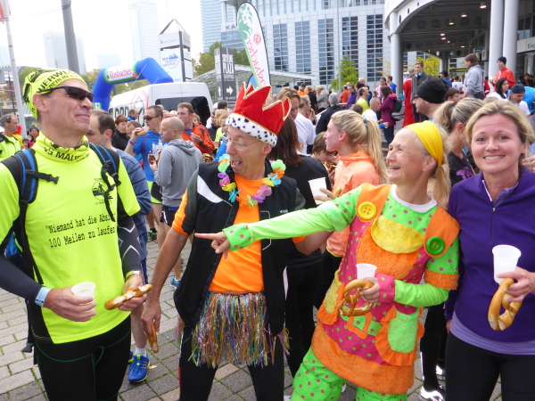 Vor der Alten Oper ist Jochen, der Vanman. Er trinkt gerade aus einem Wasserglas, blöd, deswegen mein Schrei: „Jooochen!“ Geil! Er verschluckt sich, total überrascht, verpasst fast den Spitzenläufer aller Zeiten! Sucht sein Micro, seine Stimme überschlägt sich: „Und da kommt Joe Kapps! Läuft heute seinen 358ten Marathon!“ Nicht mal die Hälfte ist wahr, aber der Menge gefällt’s. Mütter recken mir Hände, Füsse und Telefonnummern ihrer Töchter entgegen. Ich bin der Held! Ich hab die Wahl!