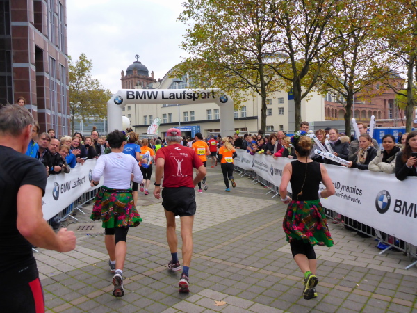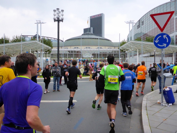 Km 40 auf der Fressgass. Dem 4:14 Pacer, der 10 Minuten nach mir gestartet ist, gebe ich einen Seitenhieb, zieh wieder kraftstroztend an der Lusche vorbei. Bei km 41 stehen die Staffelläufer, die händchenhaltend in die Festhalle einlaufen wollen. Aber bei meiner heuitgen Finisherzeit wartet ihr noch lange auf eure Schlussläufer!