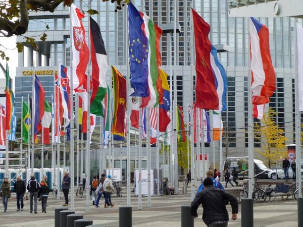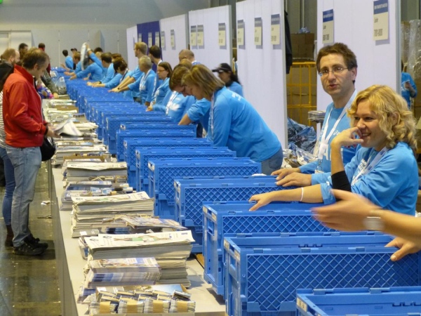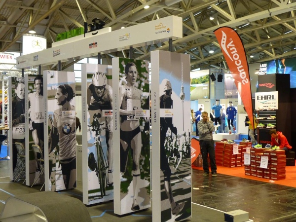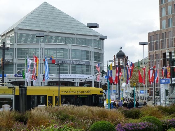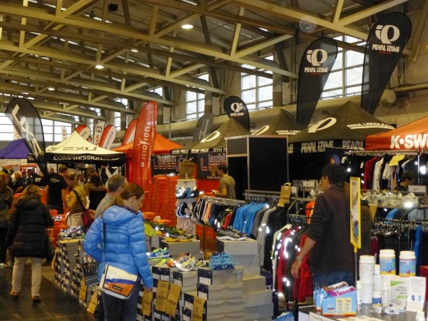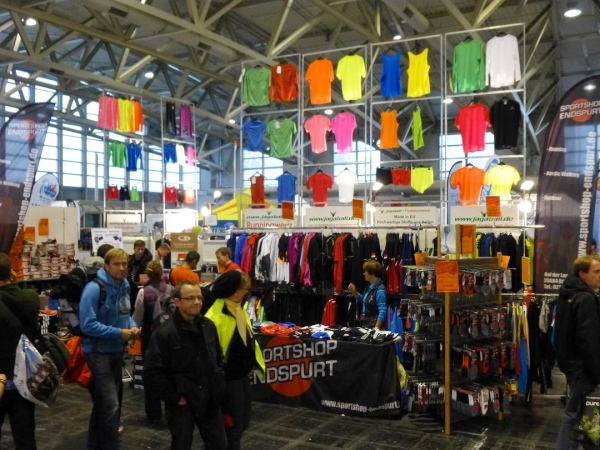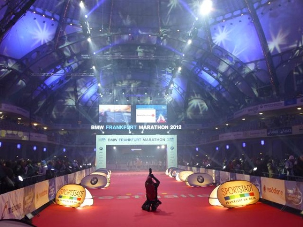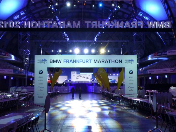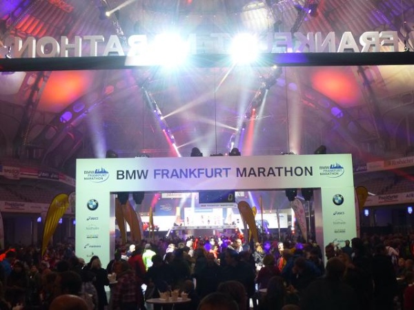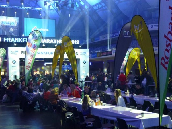 Der Frankfurt Marathon ist ein Marathon der kurzen Wege. Was sehr angenehm ist, wenn man ohnehin so viel laufen muss. Alles spielt sich auf und um das Messegelände am Rande der Innenstadt ab. In der "Marathon Mall" in Halle 1 Ebene 2 des Messegeländes bekommen wir ruck zuck die Startunterlagen: Startnummer, Programmheft, Kleiderbeutel, diverse Werbegimmicks. Originell: Die bunten "eggs for energy" - wohl schon ein Gruß vom Osterhasen. Die Messe selbst bietet aufgrund der Anbietervielfalt eine gute Gelegenheit, auf „Schnäppchen“-Jagd zu gehen. Und bei Schneegestöber und eisigem Wind draußen ist es hier gleich noch ein wenig gemütlicher.