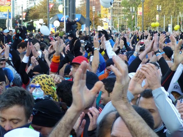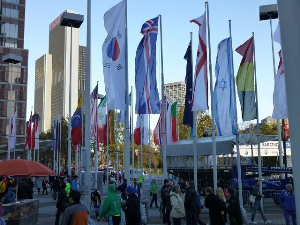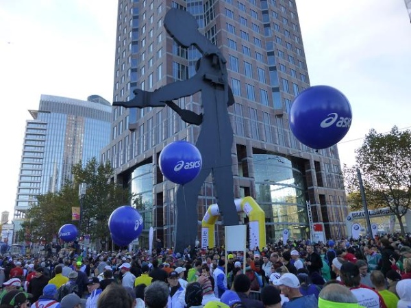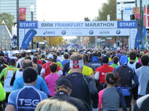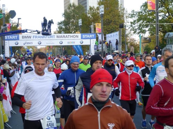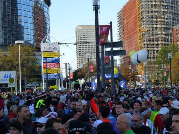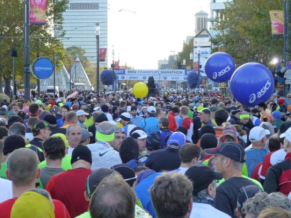 Im Schatten dieses Riesen nehmen sich die Tausende von Läufern, die sich am Sonntagmorgen auf der Friedrich Ebert-Anlage vor der Messe sammeln, wie ein riesiger wuselnder Ameisenhaufen aus. Ein höchst beeindruckender Haufen allerdings, den ich aus meiner 1,88 m-Persepktive vor und hinter mir überblicken darf. Und wuselig sind die Leute heute besonders: Bei Temperaturen knapp über dem Gefrierpunkt trotz blauem Himmel und Sonnenschein ist das allerdings kein Wunder.