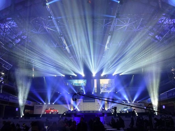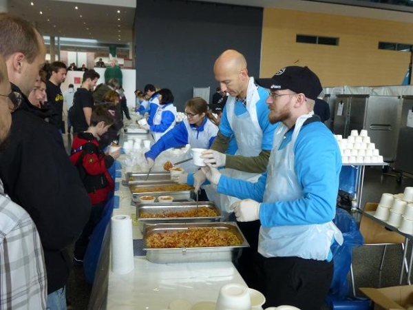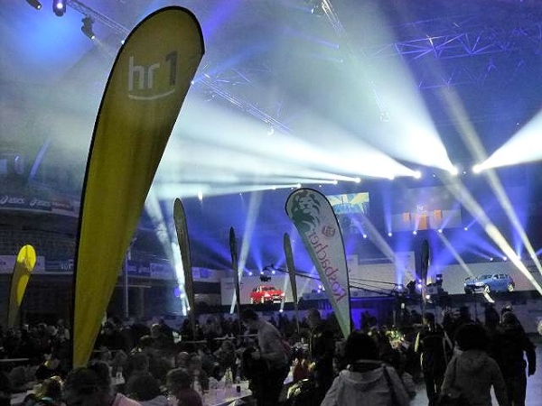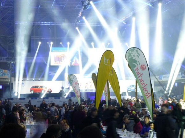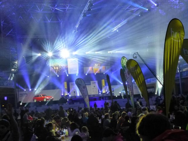 Ist der Jagdhunger gestillt, kann man dem realen Hunger in der nebenan gelegenen Festhalle, einem altehrwürdigen, über 100 Jahre alten und 40 m hohen Kuppelbau, abhelfen und sich am Samstagnachmittag auf der obligaten Nudelparty mit Pasta und diversen Freigetränken aufpäppeln lassen. Dass der Besuch dieser Party ein Muss ist, ist allerdings weniger kulinarisch begründet, als mehr durch das Spektakel, das man dort erleben darf: Künstlicher Nebel, zahllose, rotierende Strahler, von geheimnisvollem Lila über sphärisches Blau zu gleißendem Weiß changierend, zaubern in der riesigen luftigen Halle eine geradezu unglaubliche Optik. Die Lightshow ist ein beeindruckender Vorgeschmack auf das, was uns morgen beim Zieleinlauf erwartet. Dennoch ist schwer vorstellbar, wie es sich anfühlt, wenn die Halle zudem prall mit erwartungsfrohen Menschen gefüllt ist - immerhin 7.000 Sitz- und Stehplätze stehen bereit. Die Vorfreue steigt ....