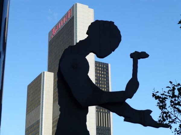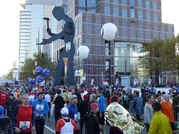 Stolze 23 Meter ist sie hoch, die symbolträchtige Skulptur des "Hammering Man" von Jonathan Borofsky direkt am Startpunkt. Die Symbolik für den Marathonläufer ist allerdings nur eine zufällige - eigentlich hatte der Künstler den klassischen Arbeiter im Sinn. Dem Läufer ist es einerlei: Heute avanciert sie zur marathonischen Kultfigur, auch wenn sich die im Moment noch niemand von ihr mental verfolgt fühlt. Ein wenig unter geht die Dimension im Angesicht des wie ein gigantischer Leuchtturm das Messegelände überragenden Messeturms. 265,5 m hoch, mit viel rosa Granit, Glas und Art Deco-Elementen hat ihn Stararchirekt Helmut Jahn gestaltet. "Postmoderner Campanile" nennen ihn Kulturbeflissene, Millionengrab diejenigen, die in ihn investiert haben.