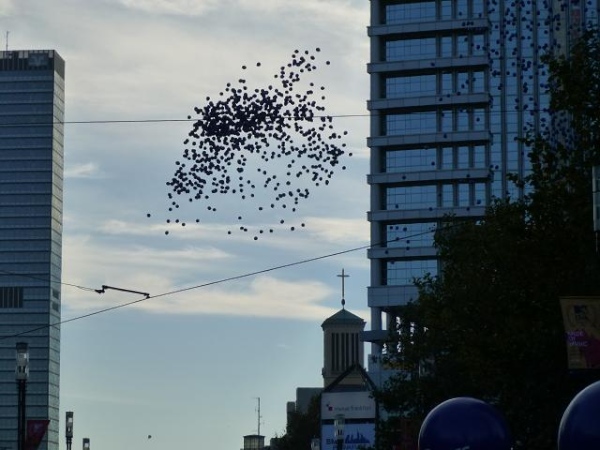 Nur noch Sekunden sind es bis zum Start, die Arme der Läufer recken sich zum Himmel, Hunderten blauer Luftballons wird die Freiheit geschenkt. So schnell wie möglich suchen sie das Weite. Dann der Knall - und wie üblich passiert erst einmal gar nichts. Ein paar Minuten dauert es, bis auch ich die fiepende Startlinie erreiche. Dann - wie von Geisterhand - lichtet sich der Pulk und wir preschen los.