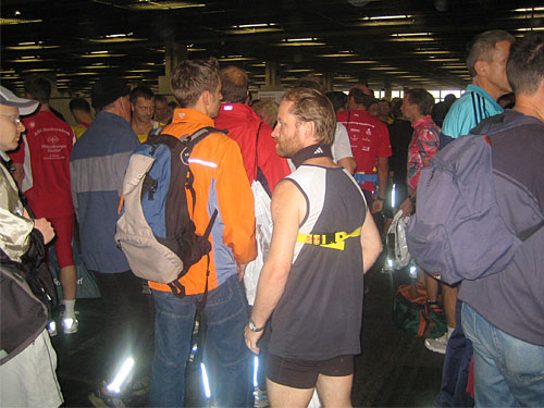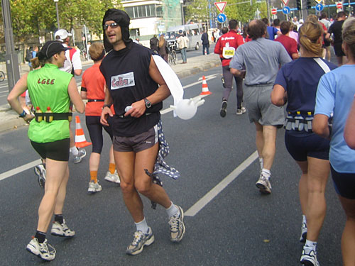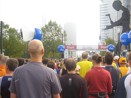 Im Feld herrscht eine lustige, lockere Stimmung, ich mach mir trotzdem vor Aufregung fast in die Hose!!! Obwohl es heute mein 16. Marathon ist, habe ich matschige Knie, das Kribbeln im Bauch, Herzrasen...wie vor’m 1. Mal! Ich find´s einfach genial und hoffe, daß dieses Gefühl nie ausbleibt! Es gehört einfach dazu!!!