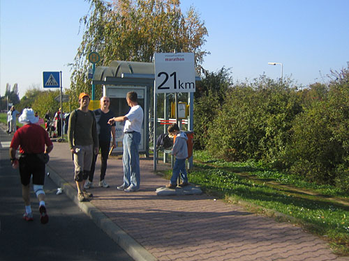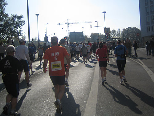Ich hab 'ne nette Laufbegleitung, mit der ich gesammelte Marathonerlebnisse austausche. Immer wieder mal ein Foto - ich fühle mich toll! Vor mir läuft ein Typ rückwärts! Wie lange er das wohl machen wird???