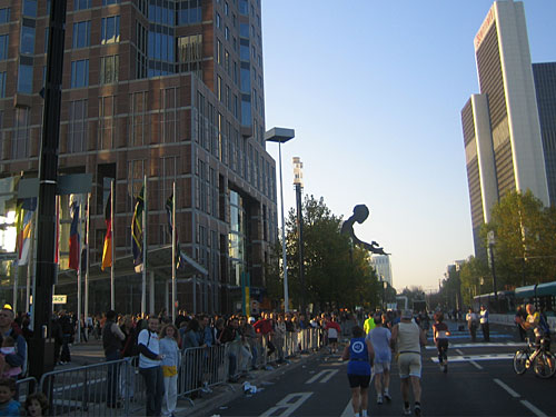 Jetzt geht´s die Treppe runter zur Kleiderabgabe, dann Richtung Starterfeld. Draußen ist es doch noch ziemlich kühl, so daß ich die angebotene Plastikfolie zum Überhängen gerne annehme. Riesig, fast drohend steht der berühmte "Mann mit dem Hammer" am Straßenrand, seinen Hammer schwingt er eifrig rauf und runter!