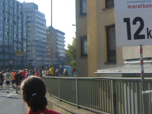 Km 26, wir laufen auf die Schwanheimer Brücke zu. Die Stimmung am Rand hält sich immer noch in Grenzen. Ab km 29 wird´s wieder zunehmend lauter. Wir nähern uns Frankfurt-Höchst. An einem Fenster stützt sich eine alte Frau mir ihrem Hund auf ein Kissen. Sie jubelt uns zu und das Läuferfeld antwortet wie abgesprochen mit einer großen La-Ola-Welle.
