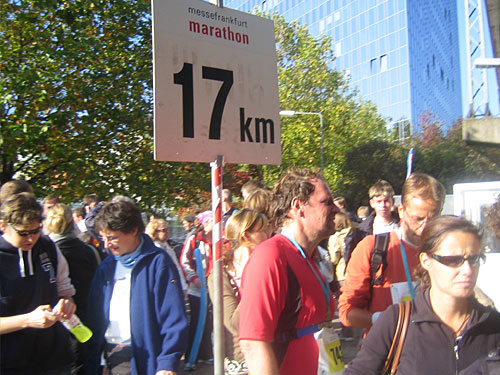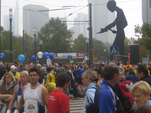 In Frankfurt kommen wir gegen 8 Uhr an. Noch sind wir ziemlich früh dran, trotzdem sieht man schon die ersten Läufer auf dem Bahnhof. Zu erkennen an Jogginghose, Laufschuhen, dem Marathon-Kleiderbeutel... man kennt sie einfach, die Läufer.