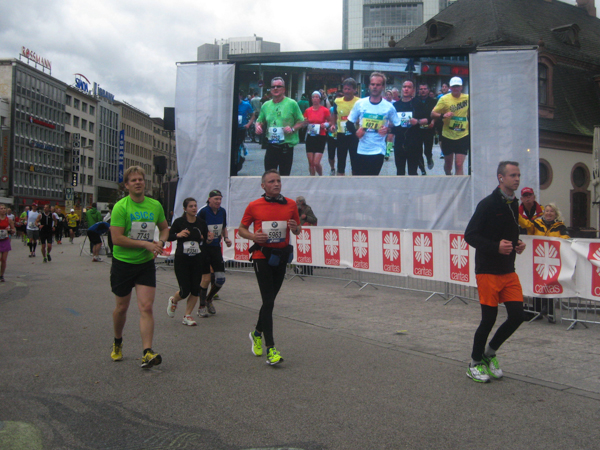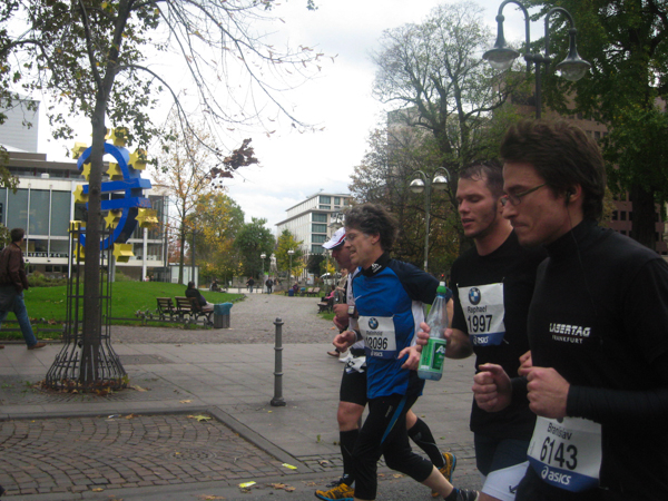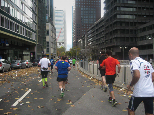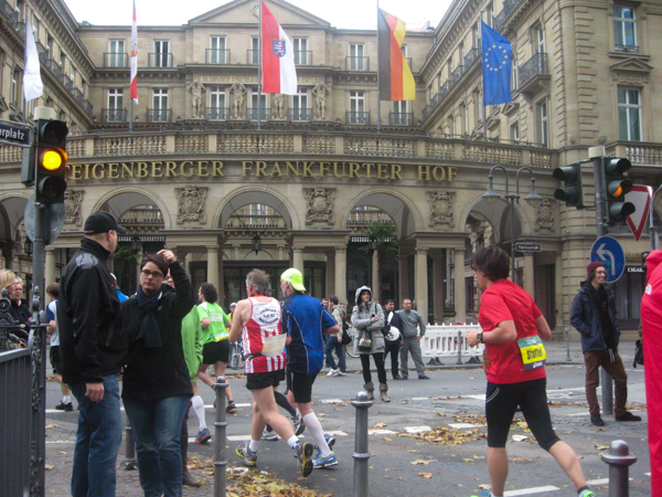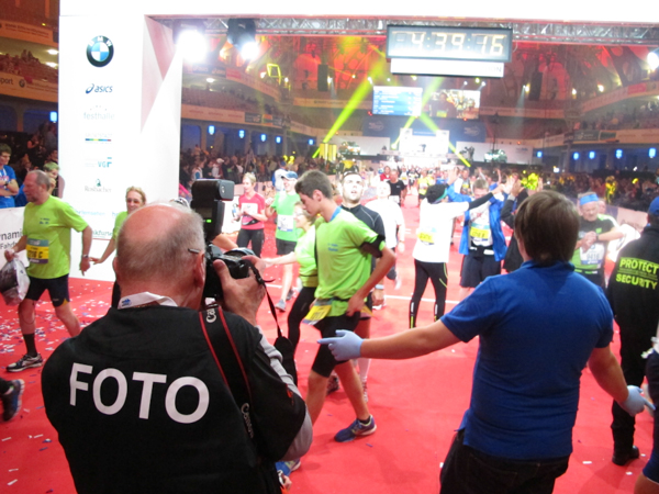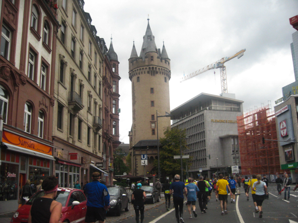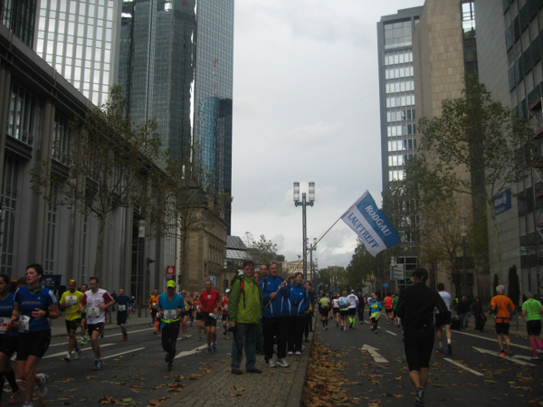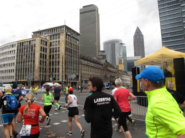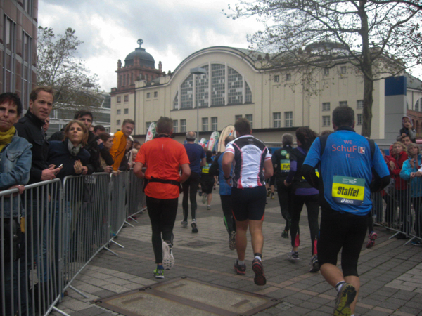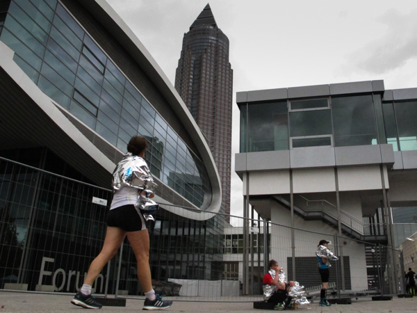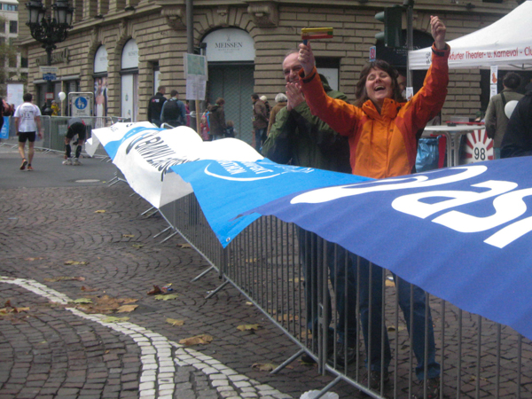 Jetzt heißt es „Rücke vor bis zur Festhalle“! Der Messeturm kommt in Sichtweite. Noch etwa ein Kilometer zu laufen. Rechts und links stehen an den Drängelgittern die begeisterten Zuschauer. Das Herbstlaub fegt den Läufern um die Ohren. Ganz so als ob der Wind einen Zieleinlauf verhindern will, pfeift er teilweise mit bis zu 75 km/h den Läufern entgegen. Der Hammermann weist den Weg hinein in die Festhalle.