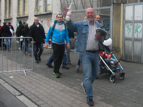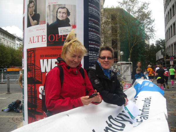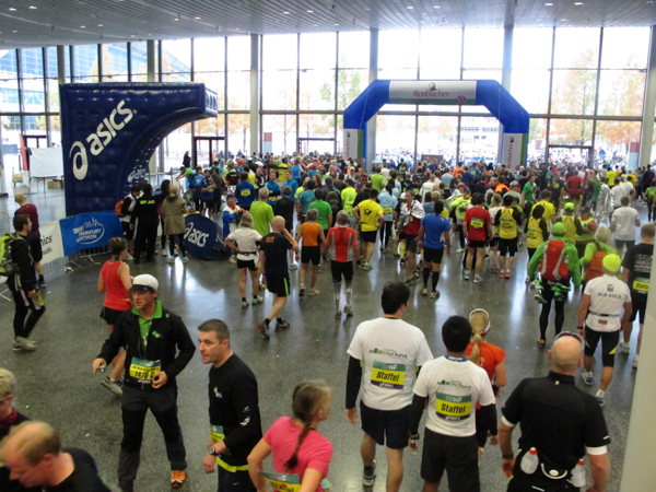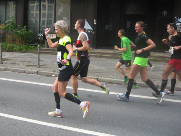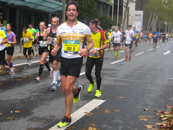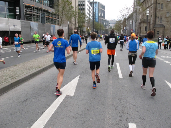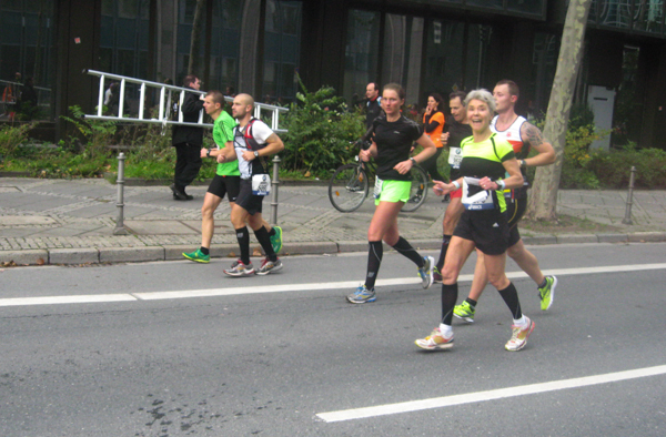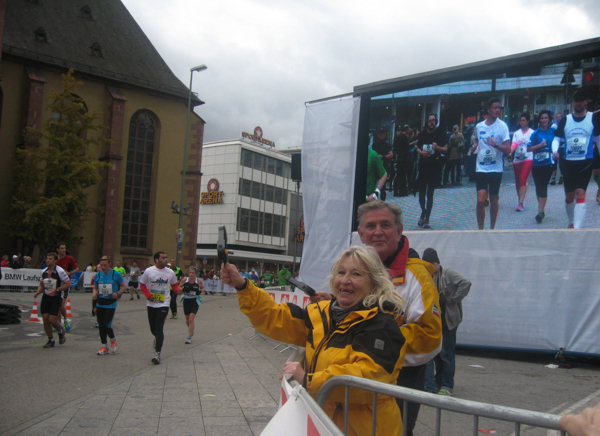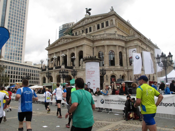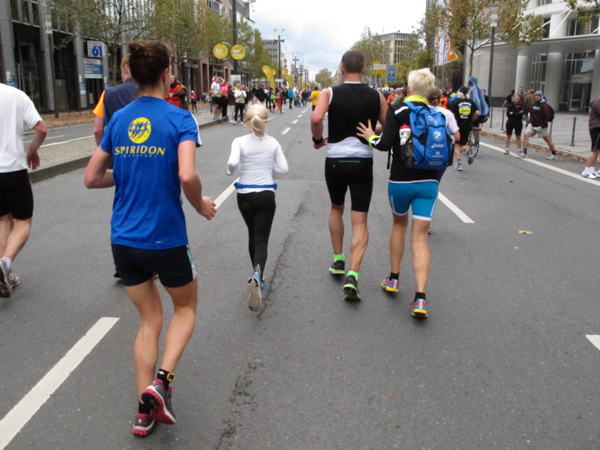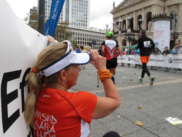 Jetzt heißt es „Rücke vor bis zur Festhalle“! Der Messeturm kommt in Sichtweite. Noch etwa ein Kilometer zu laufen. Rechts und links stehen an den Drängelgittern die begeisterten Zuschauer. Das Herbstlaub fegt den Läufern um die Ohren. Ganz so als ob der Wind einen Zieleinlauf verhindern will, pfeift er teilweise mit bis zu 75 km/h den Läufern entgegen. Der Hammermann weist den Weg hinein in die Festhalle.