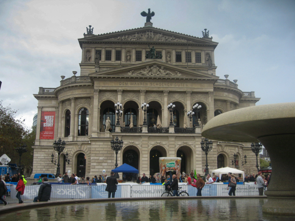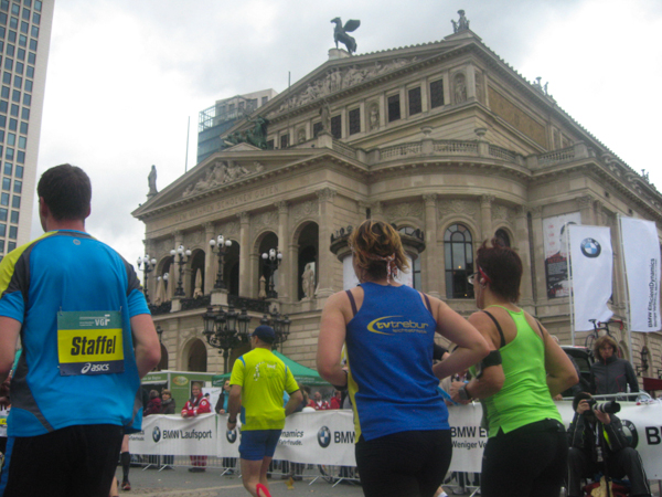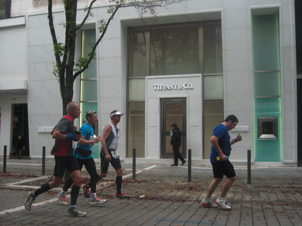 Kleine Geschäfte mit großen Schaufenstern, die mit ihren zurückhaltenden Auslagen das Wort "Luxus" neu definieren. Kaum bezahlbare Schuhe und Taschen aufgestellt wie Unikate in einem Museum. Bei Kilometer 37 bin ich völlig unbeeindruckt von den wunderschönen Auslagen und ziehe inmitten der Läufermasse an den Schaufenstern vorbei (vor Tiffany stoppe ich doch mal kurz). Bereits nach einer Minute liegt die Markenwelt in der teuersten Einkaufsstraße der Stadt schon wieder hinter mir. Und ein ganz anderes Kapitel in Frankfurts Geschichte vor mir.