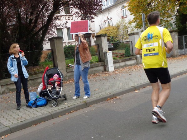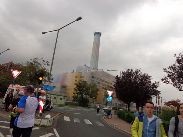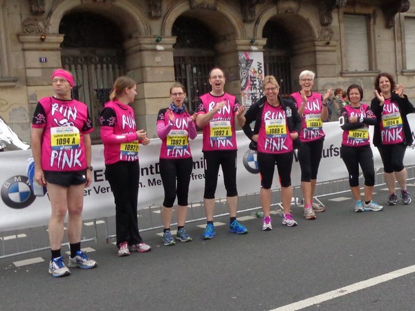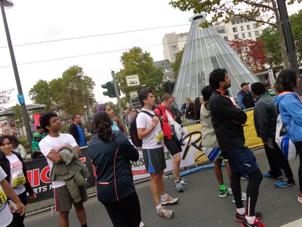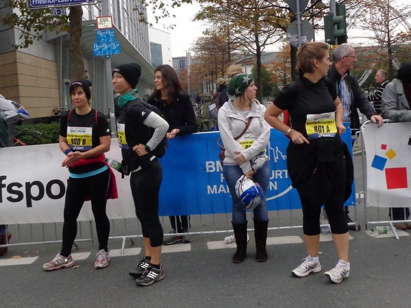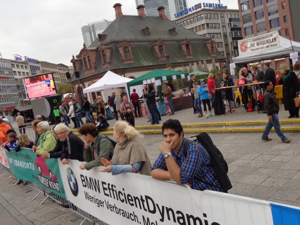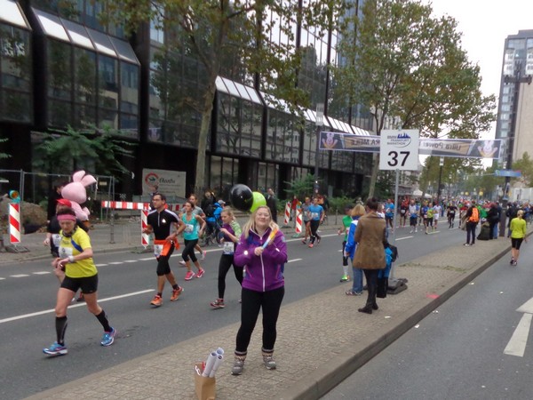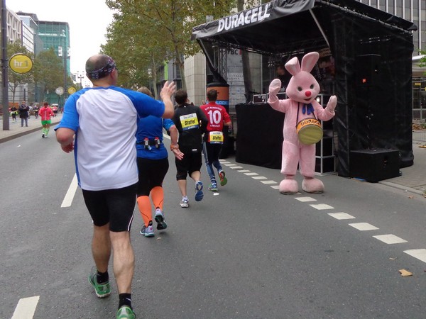 Der Duracell-Hase auf der Mainzer Hauptstraße hat tatsächlich durchgehalten, jetzt sind wir bei km41. Wir biegen rechts ein und haben nun den Messeturm wenige 100m vor uns. Auf der Strecke warten in 3er-Gruppen StaffelteilnehmerInnen auf ihre Schlussläufer.