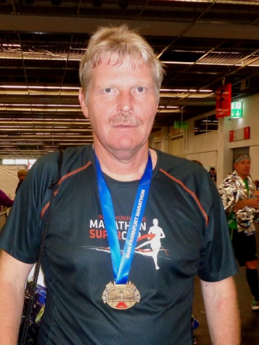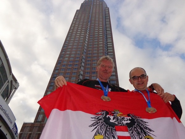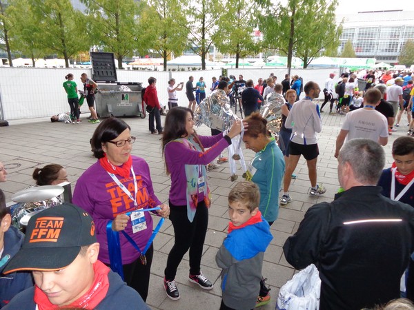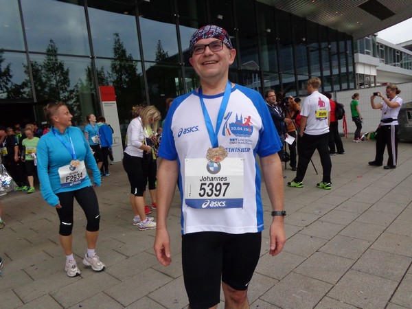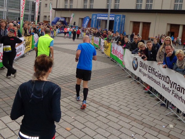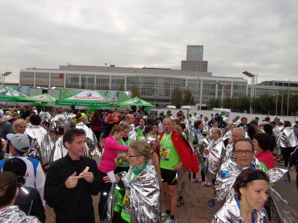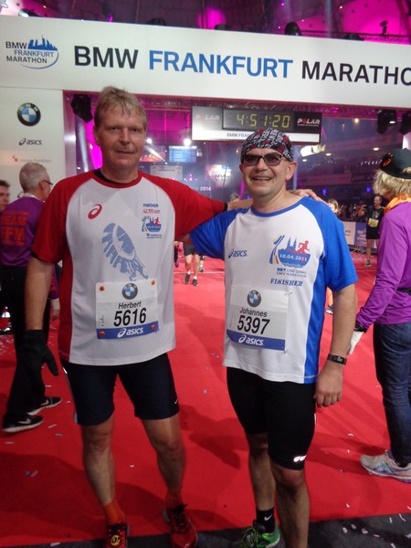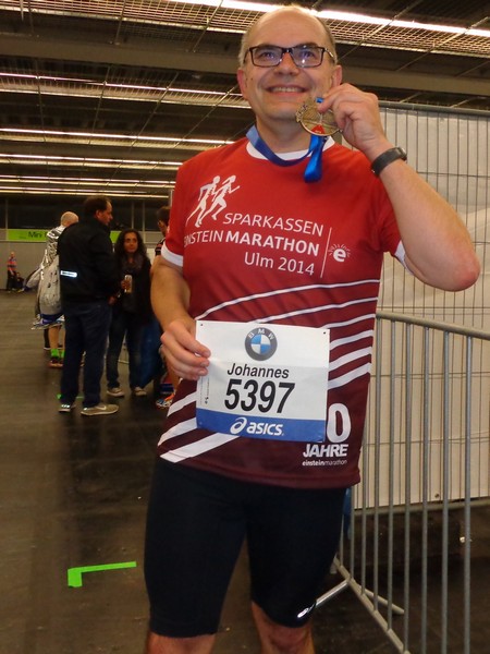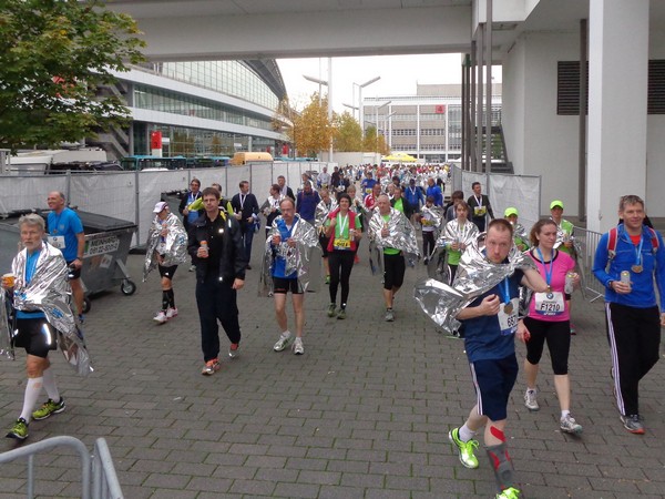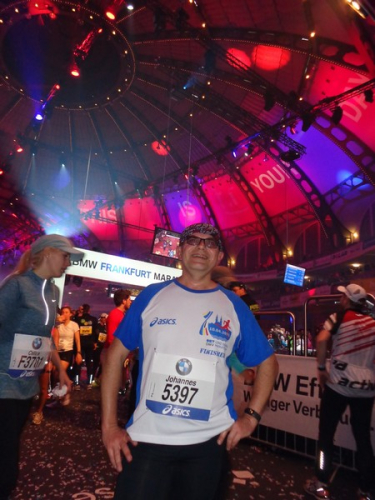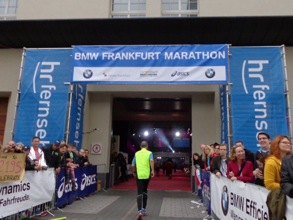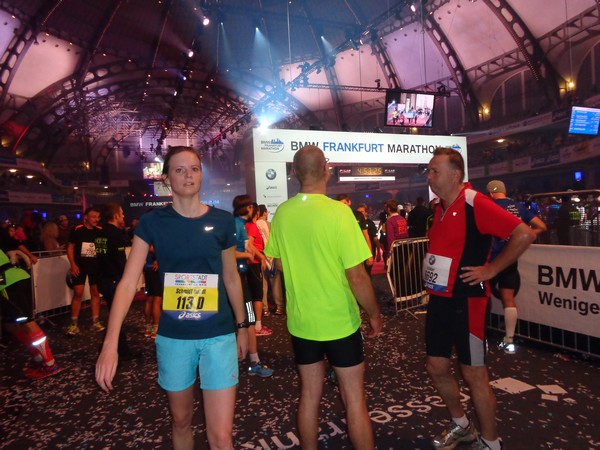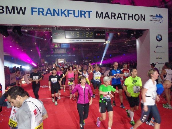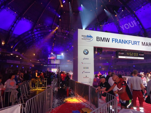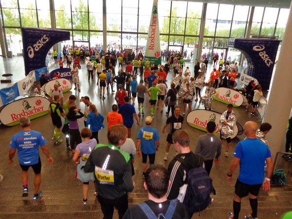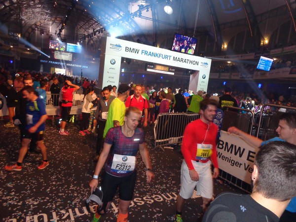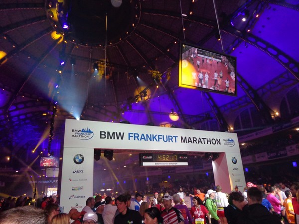Das heißt, wir sind schneller als viele Staffeln! Eingang Festhalle, gemeinsam laufen wir in die dunkle Festhalle ein, Hannes links, ich rechts, ein dröhnendes „Summer of ’69“ aus den Boxen, der Hallensprecher begrüßt uns, wir und viele andere laufen mit breiter Brust über der Ziellinie. 4h34, Mission erfüllt. Das ging ja schnell!